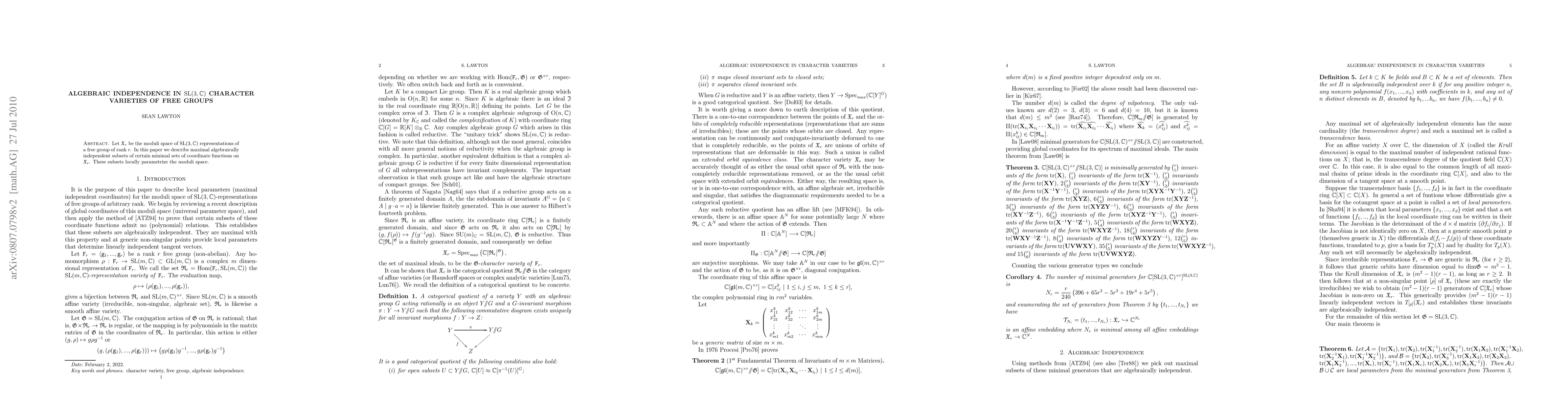 This paper investigates the moduli space X of SL(3,C) representations of a free group of rank r, identifying maximal algebraically independent subsets of coordinate functions that locally parametrize X. The findings provide insights into the structure of character varieties in algebraic geometry.