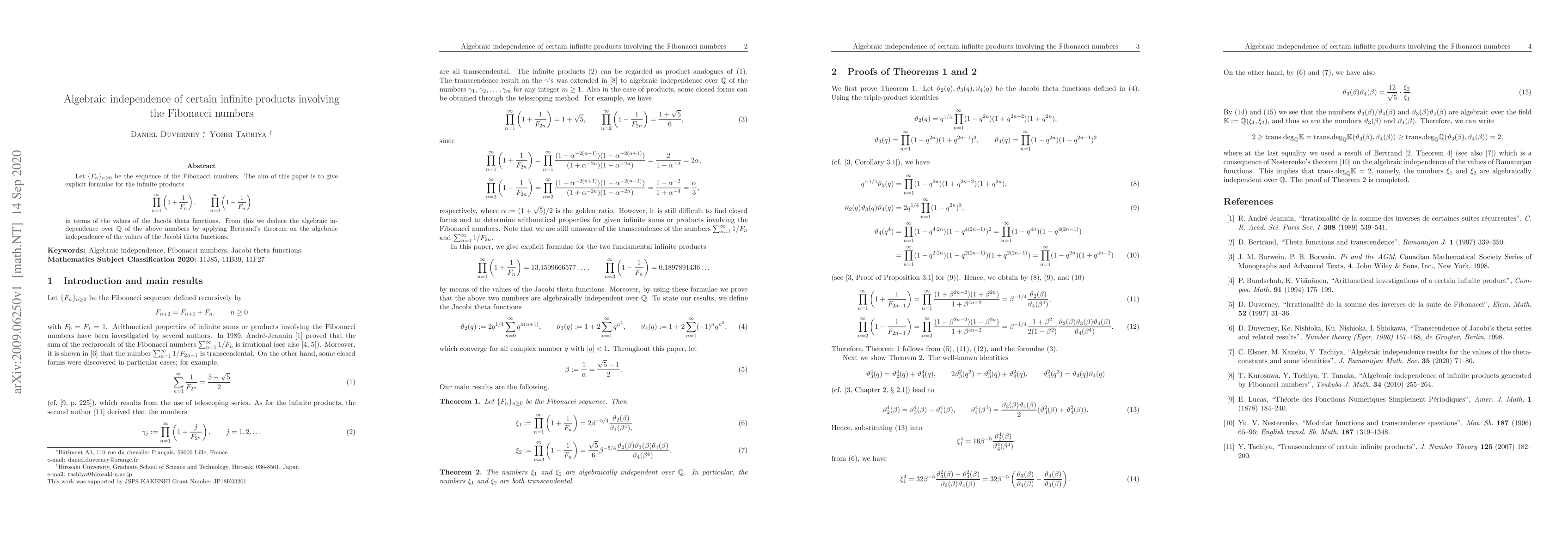 This paper derives explicit formulae for two infinite products involving Fibonacci numbers in terms of Jacobi theta functions and uses Bertrand's theorem to establish their algebraic independence over the rationals.