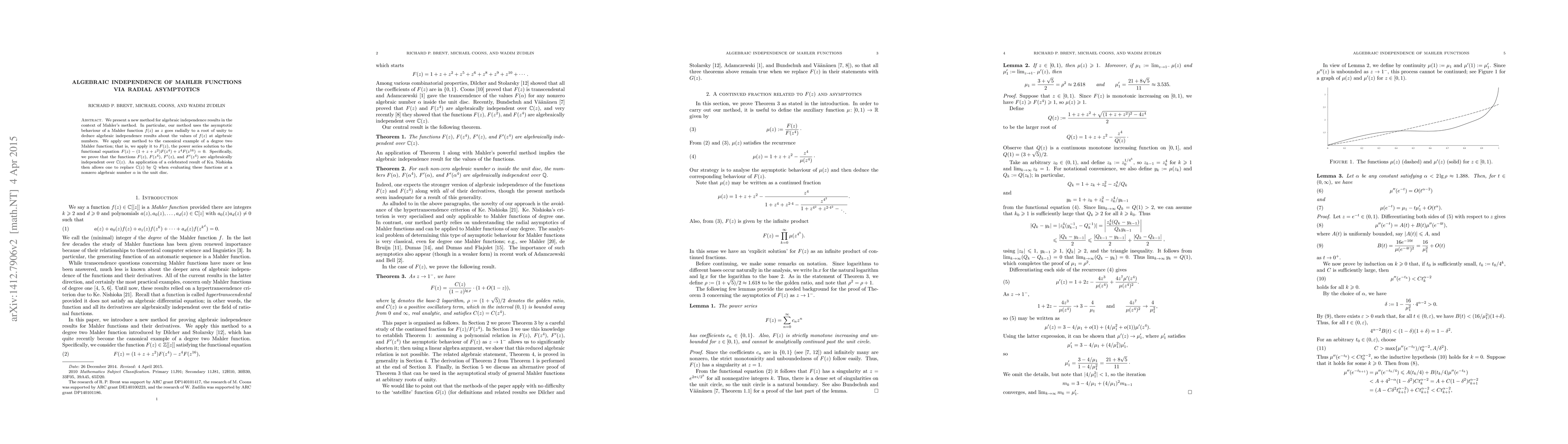 We present a new method for algebraic independence results in the context of Mahler's method. In particular, our method uses the asymptotic behaviour of a Mahler function $f(z)$ as $z$ goes radially to a root of unity to deduce algebraic independence results about the values of $f(z)$ at algebraic numbers. We apply our method to the canonical example of a degree two Mahler function; that is, we apply it to $F(z)$, the power series solution to the functional equation $F(z)-(1+z+z^2)F(z^4)+z^4F(z^{16})=0$. Specifically, we prove that the functions $F(z)$, $F(z^4)$, $F'(z)$, and $F'(z^4)$ are algebraically independent over $\mathbb{C}(z)$. An application of a celebrated result of Nishioka then allows one to replace $\mathbb{C}(z)$ by $\mathbb{Q}$ when evaluating these functions at a nonzero algebraic number $\alpha$ in the unit disc.