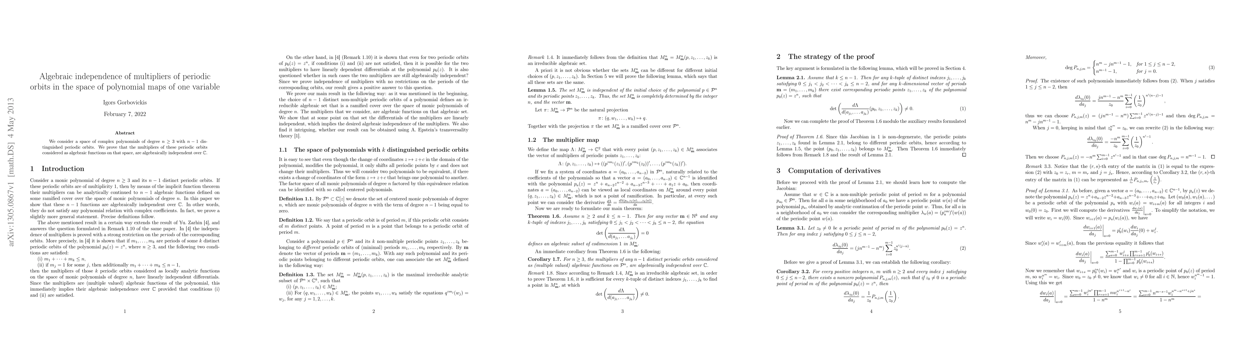 We consider a space of complex polynomials of degree $n\ge 3$ with $n-1$ distinguished periodic orbits. We prove that the multipliers of these periodic orbits considered as algebraic functions on that space, are algebraically independent over the field of complex numbers.