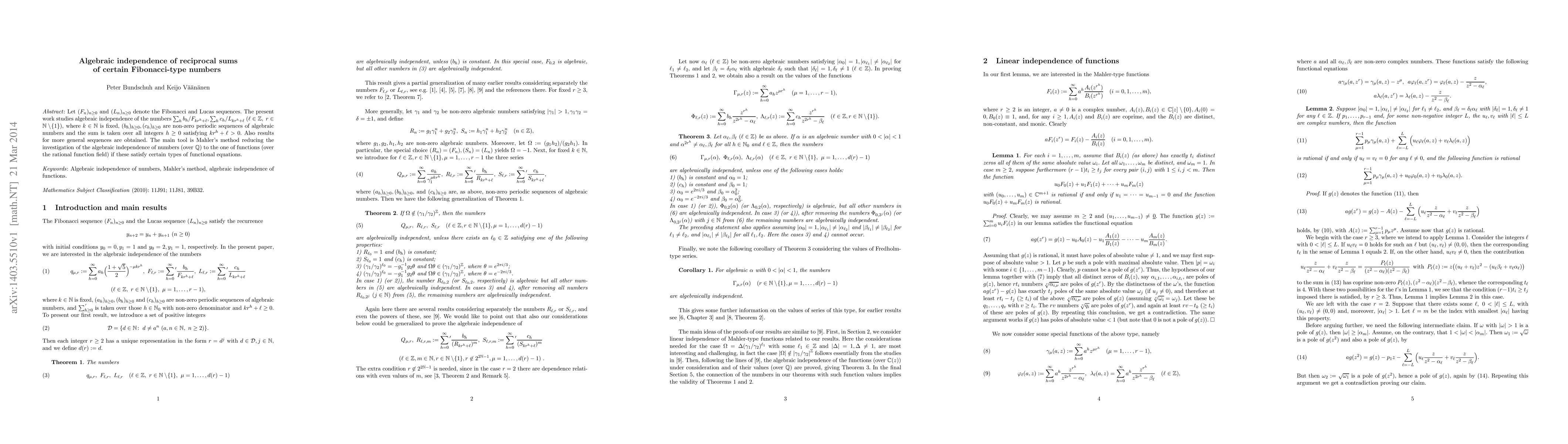 The paper investigates the algebraic independence of reciprocal sums from Fibonacci and Lucas sequences using Mahler's method, focusing on binary recurrences and functional equations. The study aims to determine if these sums are algebraically independent by examining the underlying functional properties.