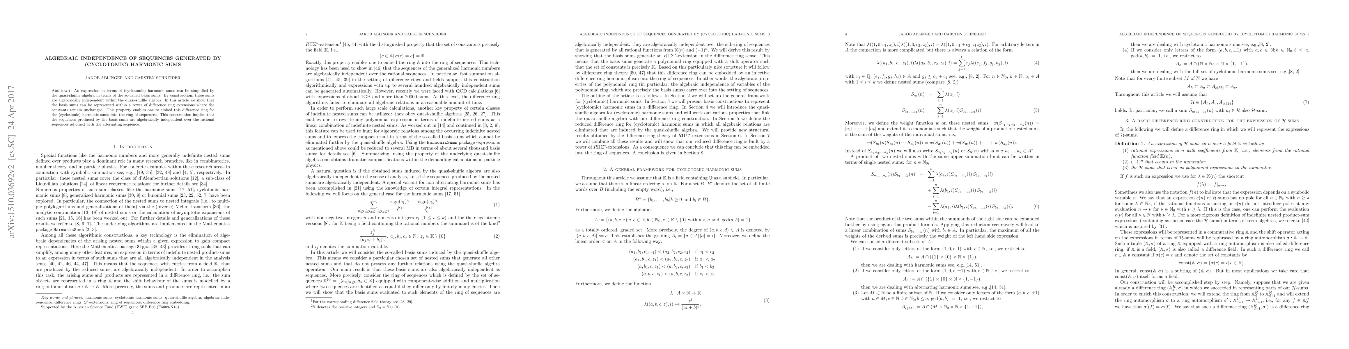 Summary: The paper demonstrates that cyclotomic harmonic sums, when simplified via quasi-shuffle algebra, yield basis sums that are algebraically independent. These basis sums can be embedded into a ring of sequences, proving that sequences generated by them remain algebraically independent over rational sequences and the alternating sequence.