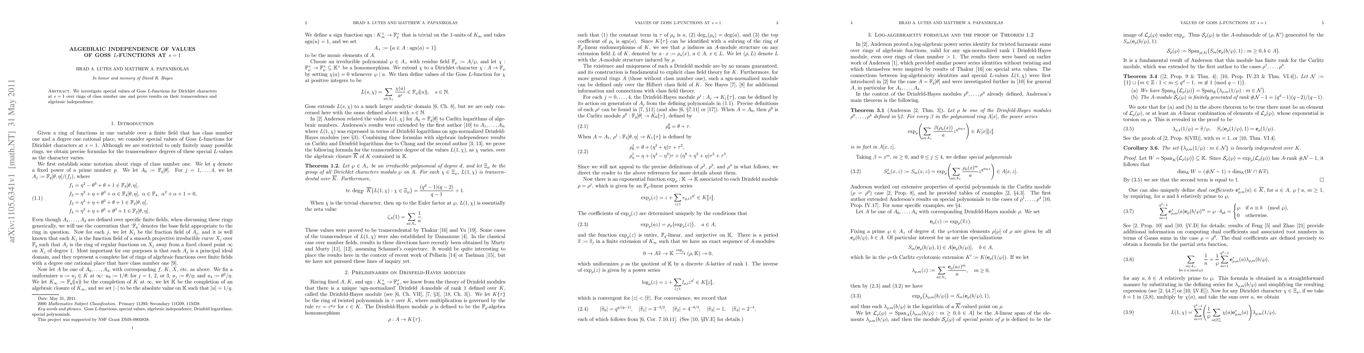 The research investigates special values of Goss L-functions for Dirichlet characters at s=1 over rings of class number one, utilizing log-algebraicity formulas and properties of special polynomials in Drinfeld-Hayes modules.