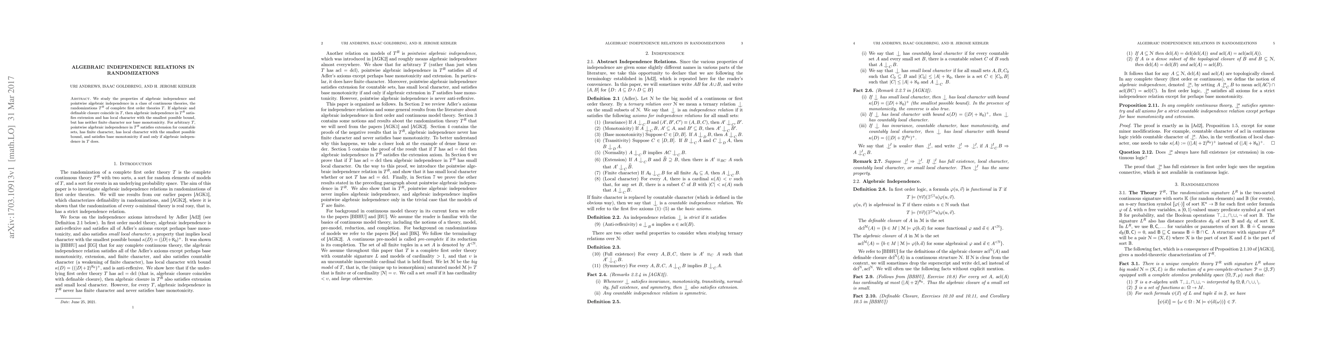 This paper investigates algebraic independence in randomizations of complete first-order theories, showing that its properties depend on the theory's characteristics, with some satisfying extension and local character, while others do not.