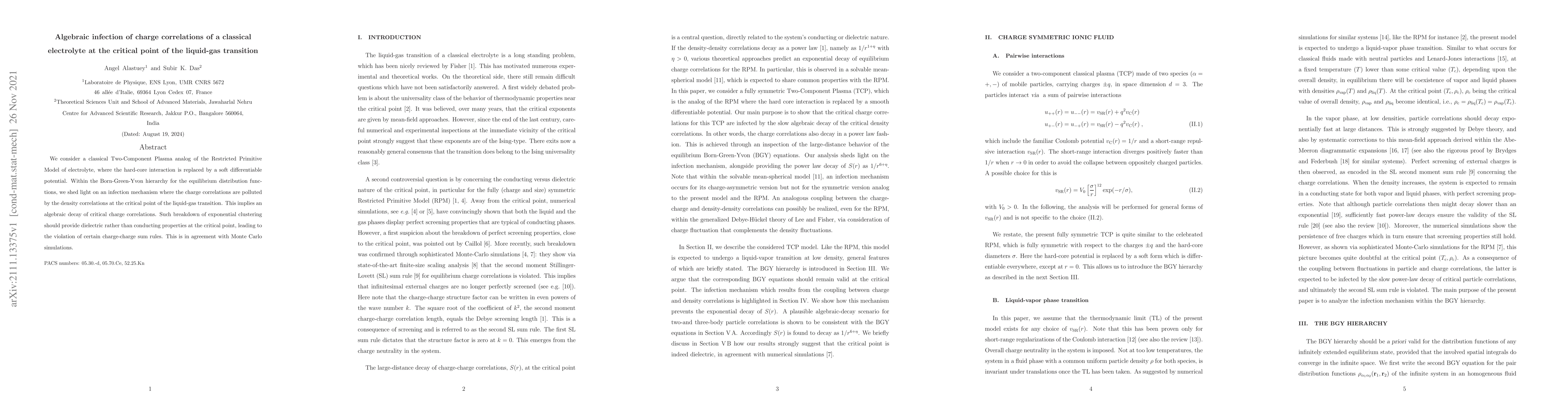 We consider a classical Two-Component Plasma analog of the Restricted Primitive Model of electrolyte, where the hard-core interaction is replaced by a soft differentiable potential. Within the Born-Green-Yvon hierarchy for the equilibrium distribution functions, we shed light on an infection mechanism where the charge correlations are polluted by the density correlations at the critical point of the liquid-gas transition. This implies an algebraic decay of critical charge correlations. Such breakdown of exponential clustering should provide dielectric rather than conducting properties at the critical point, leading to the violation of certain charge-charge sum rules. This is in agreement with Monte Carlo simulations.