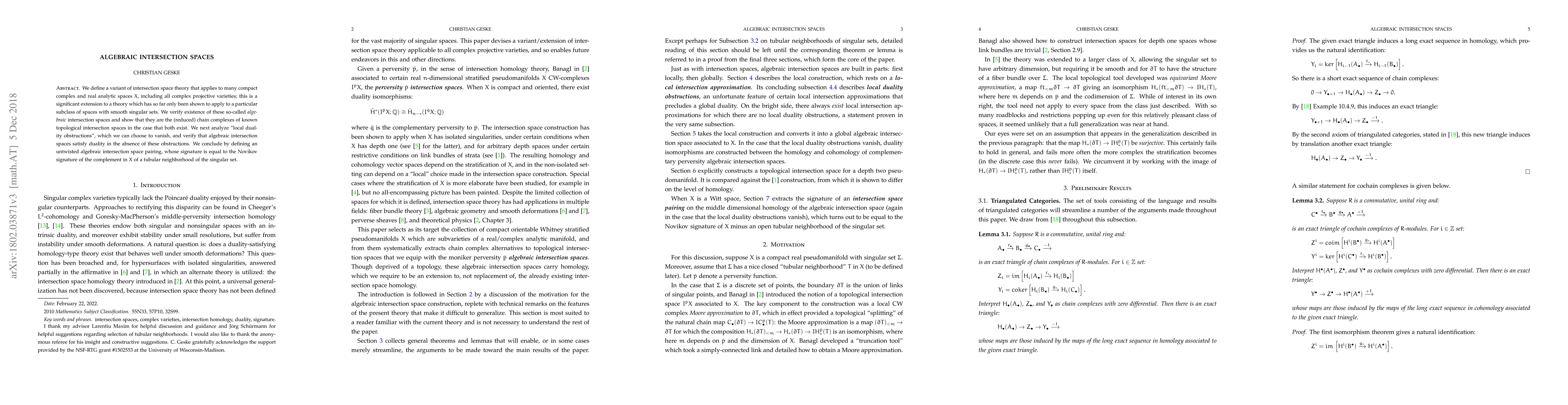 We define a variant of intersection space theory that applies to many compact complex and real analytic spaces $X$, including all complex projective varieties; this is a significant extension to a theory which has so far only been shown to apply to a particular subclass of spaces with smooth singular sets. We verify existence of these so-called algebraic intersection spaces and show that they are the (reduced) chain complexes of known topological intersection spaces in the case that both exist. We next analyze "local duality obstructions", which we can choose to vanish, and verify that algebraic intersection spaces satisfy duality in the absence of these obstructions. We conclude by defining an untwisted algebraic intersection space pairing, whose signature is equal to the Novikov signature of the complement in $X$ of a tubular neighborhood of the singular set.