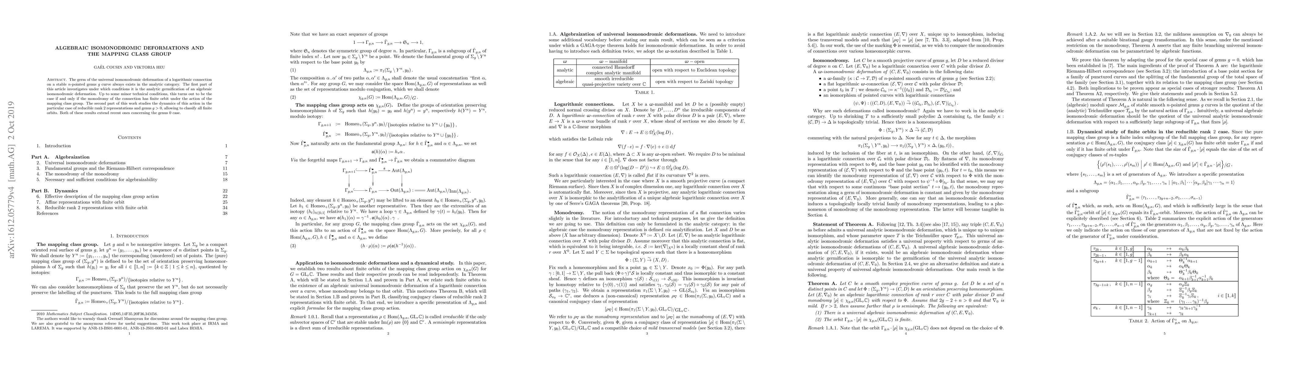 The germ of the universal isomonodromic deformation of a logarithmic connection on a stable n-pointed genus g curve always exists in the analytic category. The first part of this paper investigates under which conditions it is the analytic germification of an algebraic isomonodromic deformation. Up to some minor technical conditions, this turns out to be the case if and only if the monodromy of the connection has finite orbit under the action of the mapping class group. The second part of this paper studies the dynamics of this action in the particular case of reducible rank 2 representations and genus g > 0, allowing to classify all finite orbits. Both of these results extend recent ones concerning the genus 0 case.