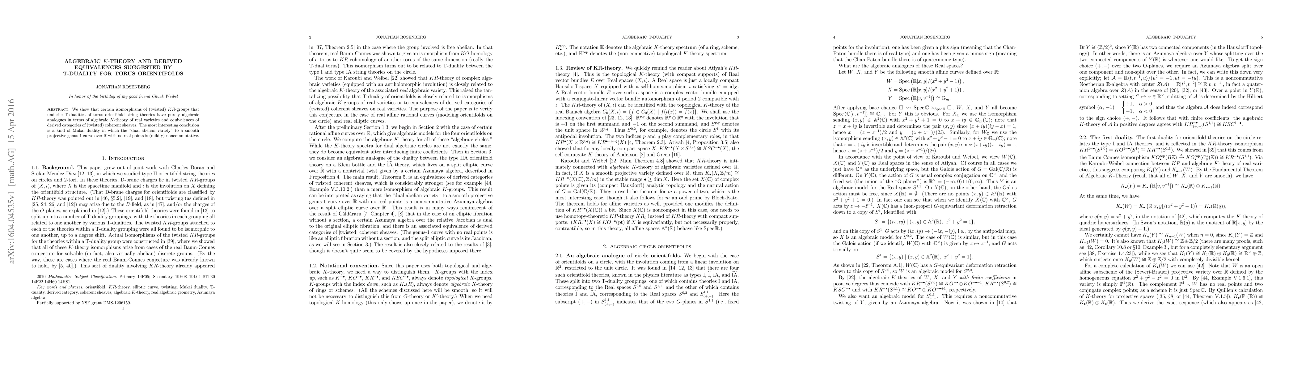 This paper demonstrates that T-dualities in torus orientifold string theories correspond to algebraic K-theory structures and derived equivalences in the context of real varieties. It reveals a noncommutative "dual abelian variety" for certain smooth projective curves, suggesting a form of Mukai duality.