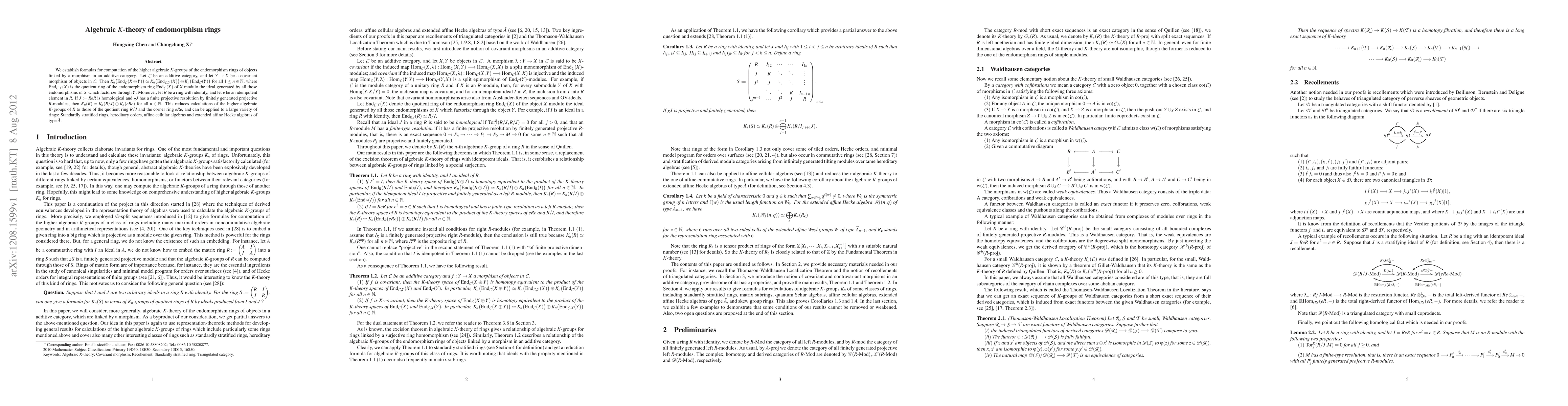 We establish formulas for computation of the higher algebraic $K$-groups of the endomorphism rings of objects linked by a morphism in an additive category. Let ${\mathcal C}$ be an additive category, and let $Y\ra X$ be a covariant morphism of objects in ${\mathcal C}$. Then $K_n\big(_{\mathcal C}(X\oplus Y)\big)\simeq K_n\big(_{{\mathcal C},Y}(X)\big)\oplus K_n\big(_{\mathcal C}(Y)\big)$ for all $1\le n\in \mathbb{N}$, where $_{{\mathcal C},Y}(X)$ is the quotient ring of the endomorphism ring $_{\mathcal C}(X)$ of $X$ modulo the ideal generated by all those endomorphisms of $X$ which factorize through $Y$. Moreover, let $R$ be a ring with identity, and let $e$ be an idempotent element in $R$. If $J:=ReR$ is homological and $_RJ$ has a finite projective resolution by finitely generated projective $R$-modules, then $K_n(R)\simeq K_n(R/J)\oplus K_n(eRe)$ for all $n\in \mathbb{N}$. This reduces calculations of the higher algebraic $K$-groups of $R$ to those of the quotient ring $R/J$ and the corner ring $eRe$, and can be applied to a large variety of rings: Standardly stratified rings, hereditary orders, affine cellular algebras and extended affine Hecke algebras of type $\tilde{A}$.