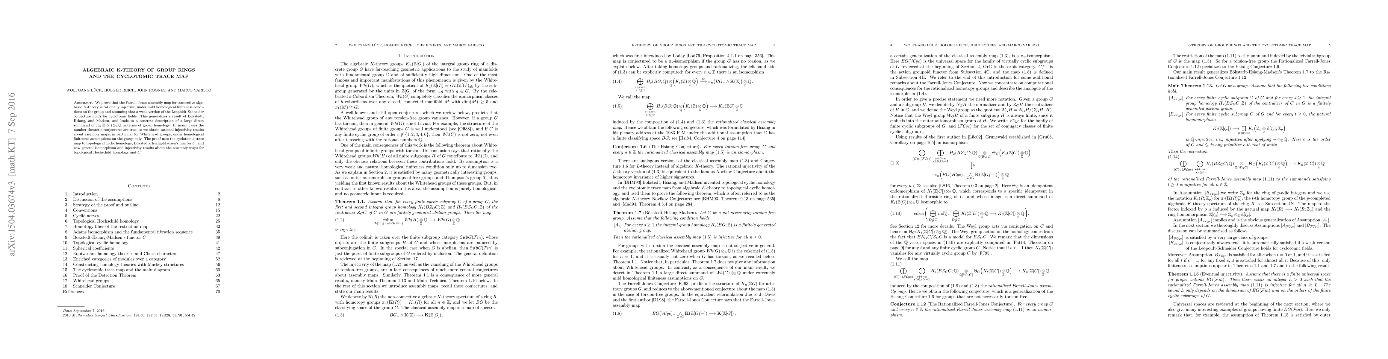 We prove that the Farrell-Jones assembly map for connective algebraic K-theory is rationally injective, under mild homological finiteness conditions on the group and assuming that a weak version of the Leopoldt-Schneider conjecture holds for cyclotomic fields. This generalizes a result of B\"okstedt, Hsiang, and Madsen, and leads to a concrete description of a large direct summand of $K_n(\mathbb{Z}[G])\otimes_{\mathbb{Z}}\mathbb{Q}$ in terms of group homology. In many cases the number theoretic conjectures are true, so we obtain rational injectivity results about assembly maps, in particular for Whitehead groups, under homological finiteness assumptions on the group only. The proof uses the cyclotomic trace map to topological cyclic homology, B\"okstedt-Hsiang-Madsen's functor C, and new general isomorphism and injectivity results about the assembly maps for topological Hochschild homology and C.