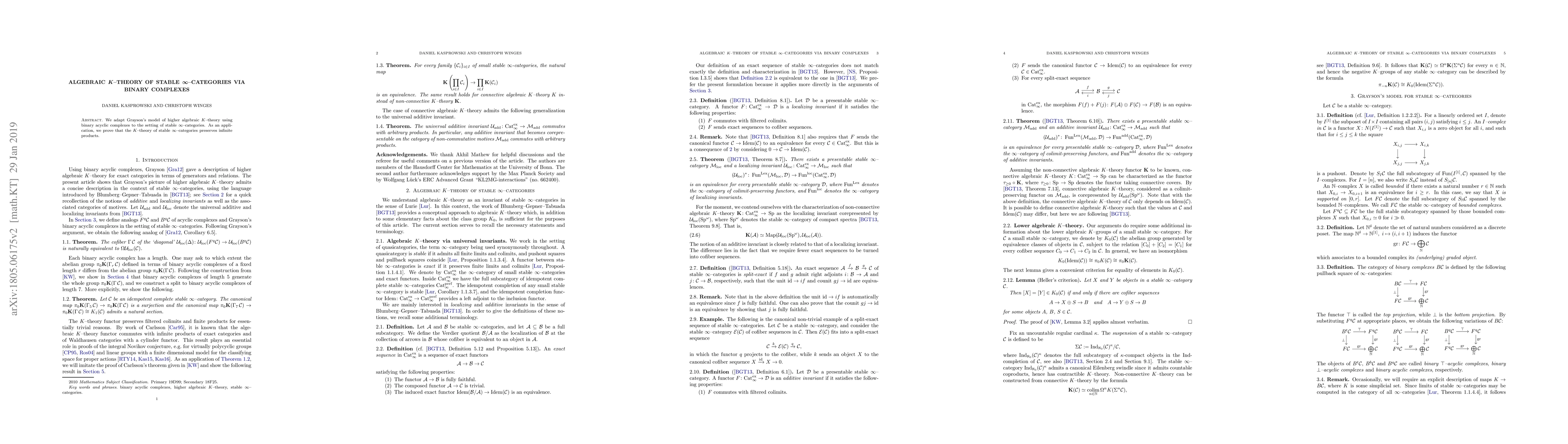 This paper extends Grayson's model of higher algebraic K-theory for binary acyclic complexes to stable $\infty$-categories, proving that the K-theory of these categories preserves infinite products.