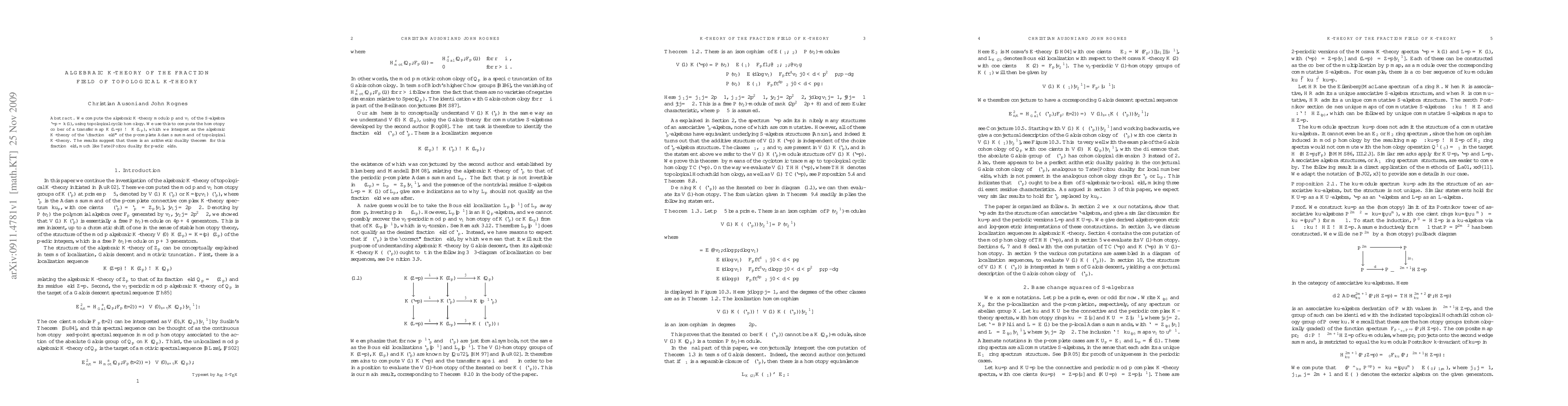 We compute the algebraic K-theory modulo p and v_1 of the S-algebra ell/p = k(1), using topological cyclic homology. We use this to compute the homotopy cofiber of a transfer map K(L/p) --> K(L_p), which we interpret as the algebraic K-theory of the "fraction field" of the p-complete Adams summand of topological K-theory. The results suggest that there is an arithmetic duality theorem for this fraction field, much like Tate--Poitou duality for p-adic fields.