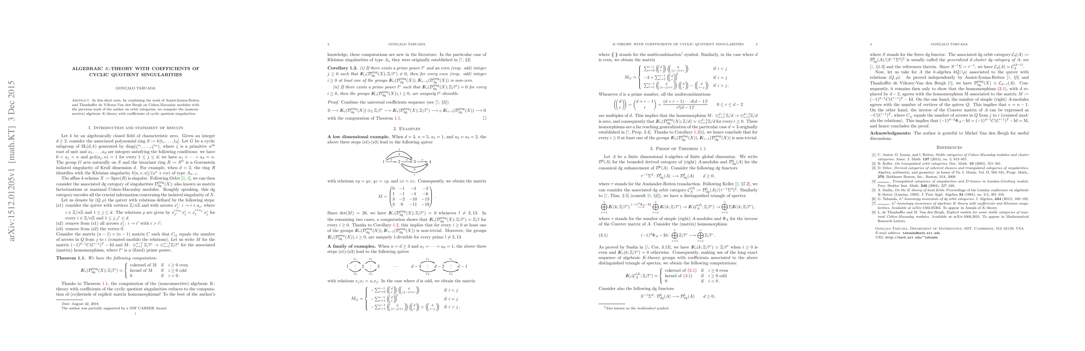 The paper computes the nonconnective algebraic K-theory with coefficients for cyclic quotient singularities, leveraging previous research on Cohen-Macaulay modules and orbit categories. The result integrates findings from Amiot-Iyama-Reiten and Thanhoffer de Volcsey-Van den Bergh.