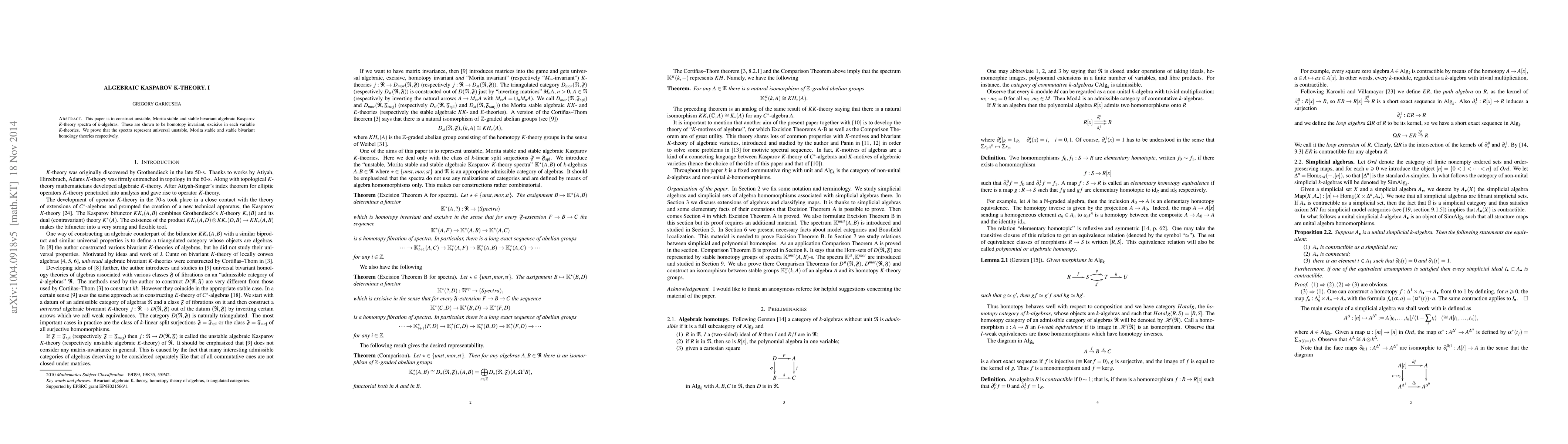 This paper constructs algebraic Kasparov K-theory spectra for k-algebras, demonstrating their homotopy invariance and excision properties. It proves these spectra represent universal unstable, Morita stable, and stable bivariant homology theories.