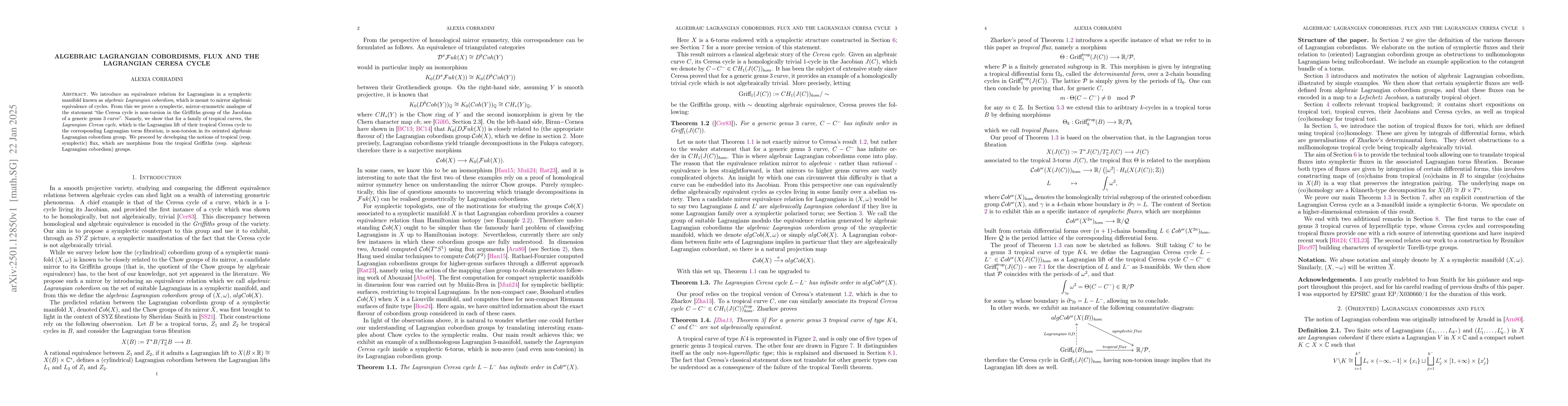 We introduce an equivalence relation for Lagrangians in a symplectic manifold known as \textit{algebraic Lagrangian cobordism}, which is meant to mirror algebraic equivalence of cycles. From this we prove a symplectic, mirror-symmetric analogue of the statement \enquote{the Ceresa cycle is non-torsion in the Griffiths group of the Jacobian of a generic genus $3$ curve}. Namely, we show that for a family of tropical curves, the \textit{Lagrangian Ceresa cycle}, which is the Lagrangian lift of their tropical Ceresa cycle to the corresponding Lagrangian torus fibration, is non-torsion in its oriented algebraic Lagrangian cobordism group. We proceed by developing the notions of tropical (resp. symplectic) flux, which are morphisms from the tropical Griffiths (resp. algebraic Lagrangian cobordism) groups.