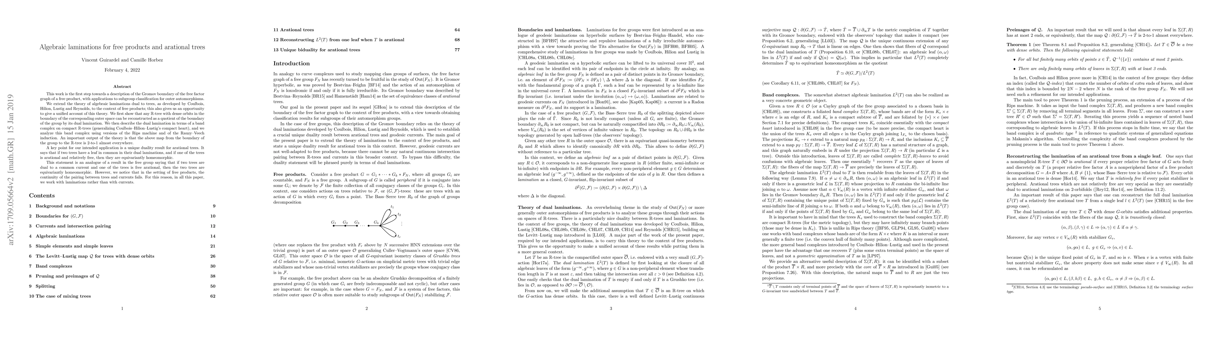 This work is the first step towards a description of the Gromov boundary of the free factor graph of a free product, with applications to subgroup classification for outer automorphisms. We extend the theory of algebraic laminations dual to trees, as developed by Coulbois, Hilion, Lustig and Reynolds, to the context of free products; this also gives us an opportunity to give a unified account of this theory. We first show that any $\mathbb{R}$-tree with dense orbits in the boundary of the corresponding outer space can be reconstructed as a quotient of the boundary of the group by its dual lamination. We then describe the dual lamination in terms of a band complex on compact $\mathbb{R}$-trees (generalizing Coulbois-Hilion-Lustig's compact heart), and we analyze this band complex using versions of the Rips machine and of the Rauzy-Veech induction. An important output of the theory is that the above map from the boundary of the group to the $\mathbb{R}$-tree is 2-to-1 almost everywhere. A key point for our intended application is a unique duality result for arational trees. It says that if two trees have a leaf in common in their dual laminations, and if one of the trees is arational and relatively free, then they are equivariantly homeomorphic. This statement is an analogue of a result in the free group saying that if two trees are dual to a common current and one of the trees is free arational, then the two trees are equivariantly homeomorphic. However, we notice that in the setting of free products, the continuity of the pairing between trees and currents fails. For this reason, in all this paper, we work with laminations rather than with currents.