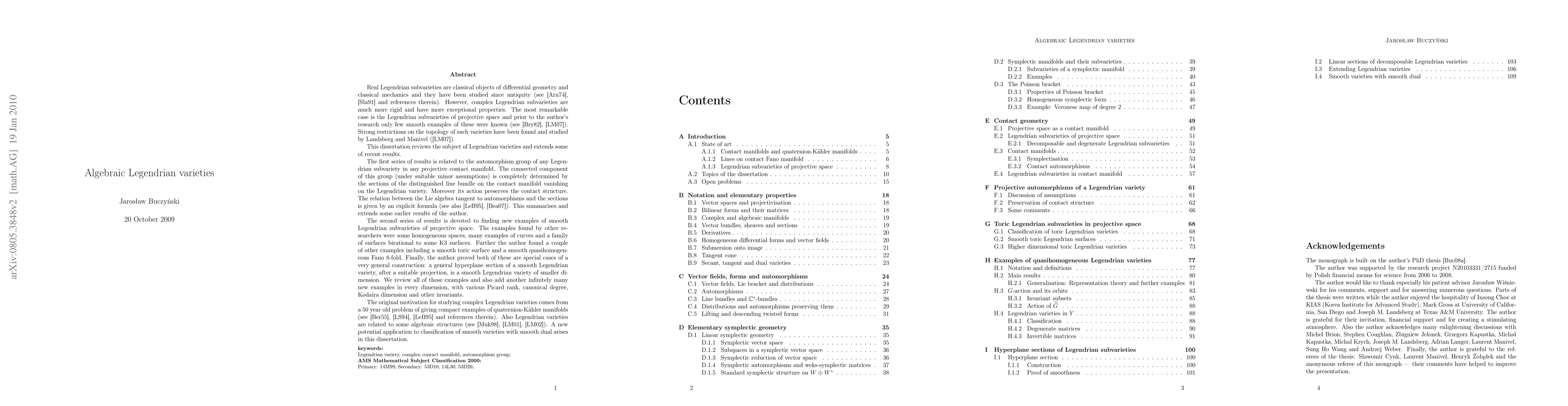 Real Legendrian subvarieties are classical objects of differential geometry and classical mechanics and they have been studied since antiquity. However, complex Legendrian subvarieties are much more rigid and have more exceptional properties. The most remarkable case is the Legendrian subvarieties of projective space and prior to the author's research only few smooth examples of these were known. The first series of results of this thesis is related to the automorphism group of any Legendrian subvariety in any projective contact manifold. The connected component of this group (under suitable minor assumptions) is completely determined by the sections of the distinguished line bundle on the contact manifold vanishing on the Legendrian variety. Moreover its action preserves the contact structure. The second series of results is devoted to finding new examples of smooth Legendrian subvarieties of projective space. The contribution of this thesis is in three steps: First we find an example of a smooth toric surface. Next we find a smooth quasihomogeneous Fano 8-fold that admits a Legendrian embedding. Finally, we realise that both of these are special cases of a very general construction: a general hyperplane section of a smooth Legendrian variety, after a suitable projection, is a smooth Legendrian variety of smaller dimension. By applying this result to known examples and decomposable Legendrian varieties, we construct infinitely many new examples in every dimension, with various Picard rank, canonical degree, Kodaira dimension and other invariants.