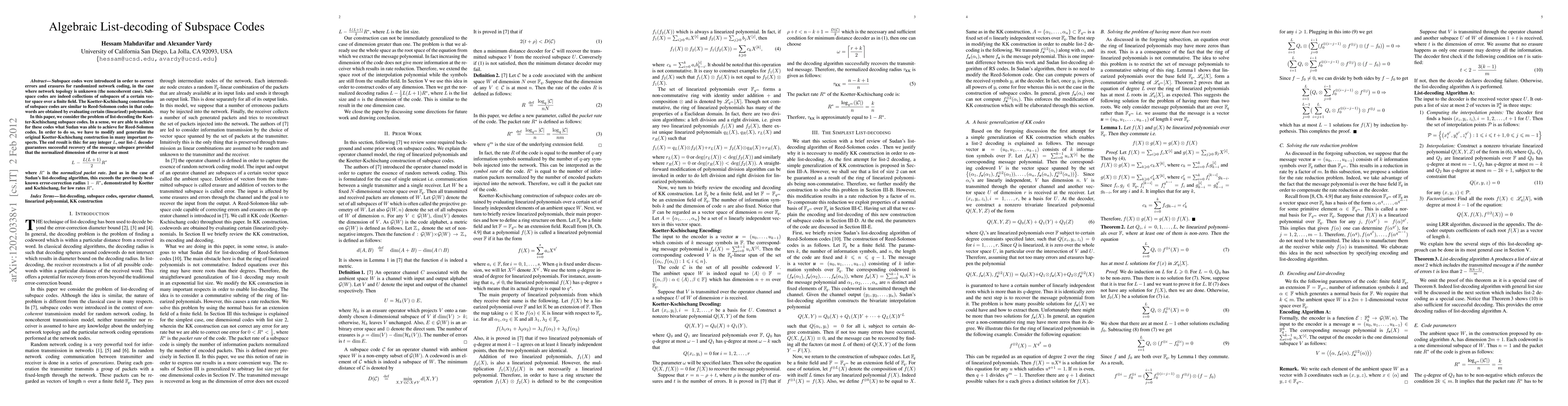 Subspace codes were introduced in order to correct errors and erasures for randomized network coding, in the case where network topology is unknown (the noncoherent case). Subspace codes are indeed collections of subspaces of a certain vector space over a finite field. The Koetter-Kschischang construction of subspace codes are similar to Reed-Solomon codes in that codewords are obtained by evaluating certain (linearized) polynomials. In this paper, we consider the problem of list-decoding the Koetter-Kschischang subspace codes. In a sense, we are able to achieve for these codes what Sudan was able to achieve for Reed-Solomon codes. In order to do so, we have to modify and generalize the original Koetter-Kschischang construction in many important respects. The end result is this: for any integer $L$, our list-$L$ decoder guarantees successful recovery of the message subspace provided that the normalized dimension of the error is at most $ L - \frac{L(L+1)}{2}R $ where $R$ is the normalized packet rate. Just as in the case of Sudan's list-decoding algorithm, this exceeds the previously best known error-correction radius $1-R$, demonstrated by Koetter and Kschischang, for low rates $R$.