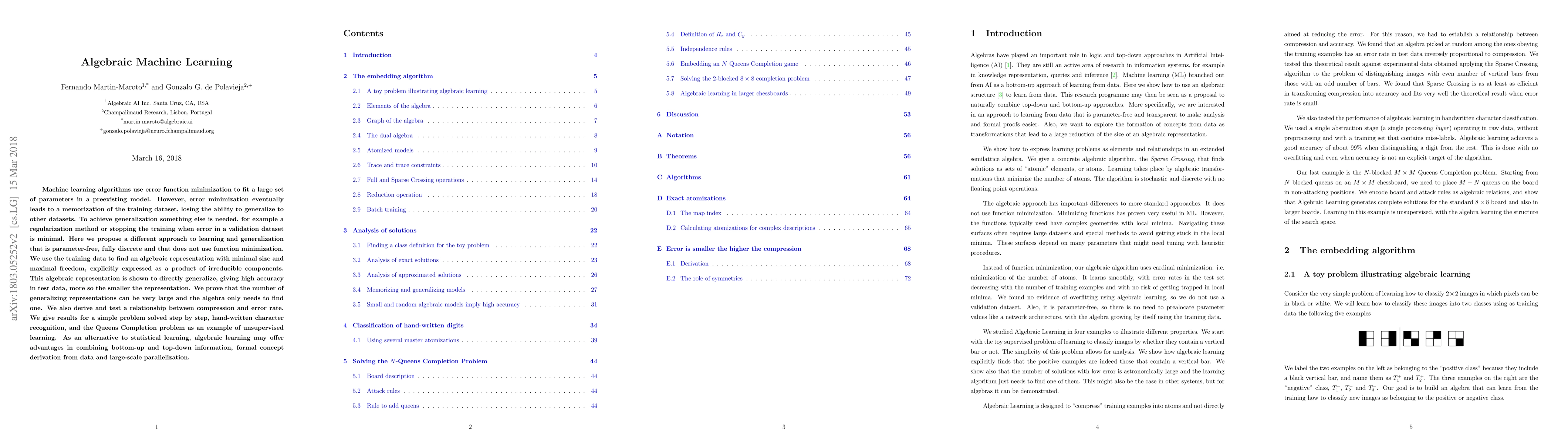 Machine learning algorithms use error function minimization to fit a large set of parameters in a preexisting model. However, error minimization eventually leads to a memorization of the training dataset, losing the ability to generalize to other datasets. To achieve generalization something else is needed, for example a regularization method or stopping the training when error in a validation dataset is minimal. Here we propose a different approach to learning and generalization that is parameter-free, fully discrete and that does not use function minimization. We use the training data to find an algebraic representation with minimal size and maximal freedom, explicitly expressed as a product of irreducible components. This algebraic representation is shown to directly generalize, giving high accuracy in test data, more so the smaller the representation. We prove that the number of generalizing representations can be very large and the algebra only needs to find one. We also derive and test a relationship between compression and error rate. We give results for a simple problem solved step by step, hand-written character recognition, and the Queens Completion problem as an example of unsupervised learning. As an alternative to statistical learning, algebraic learning may offer advantages in combining bottom-up and top-down information, formal concept derivation from data and large-scale parallelization.