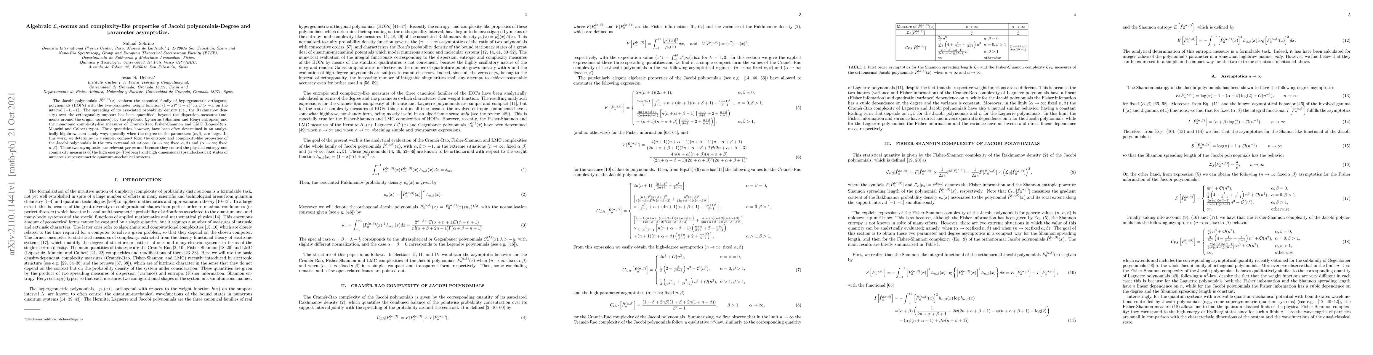 This paper explores the algebraic q-norms and complexity-like properties of Jacobi polynomials, deriving simple compact forms for entropic and complexity measures in two asymptotic situations: n approaching infinity with fixed alpha and beta, and alpha approaching infinity with fixed n and beta. These findings are relevant to understanding high-energy and high-dimensional states in supersymmetric quantum-mechanical systems.
