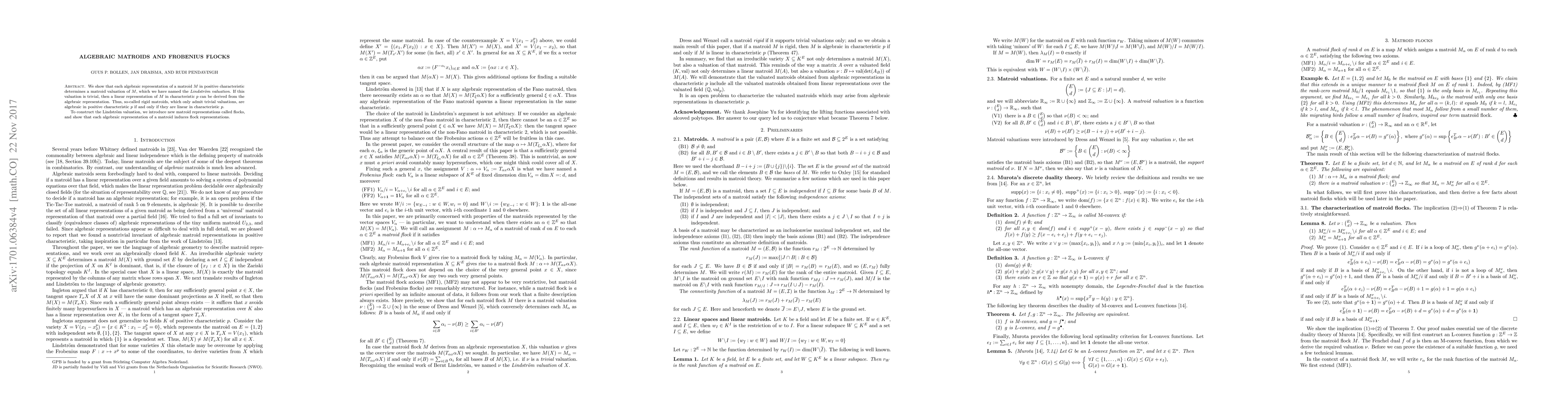This paper demonstrates that algebraic representations of matroids in positive characteristic yield a specific matroid valuation termed the Lindström valuation. Rigid matroids admitting only trivial valuations are algebraic if and only if they are linear in the same characteristic. The paper introduces new matroid representations called flocks, showing that algebraic representations induce flock representations.