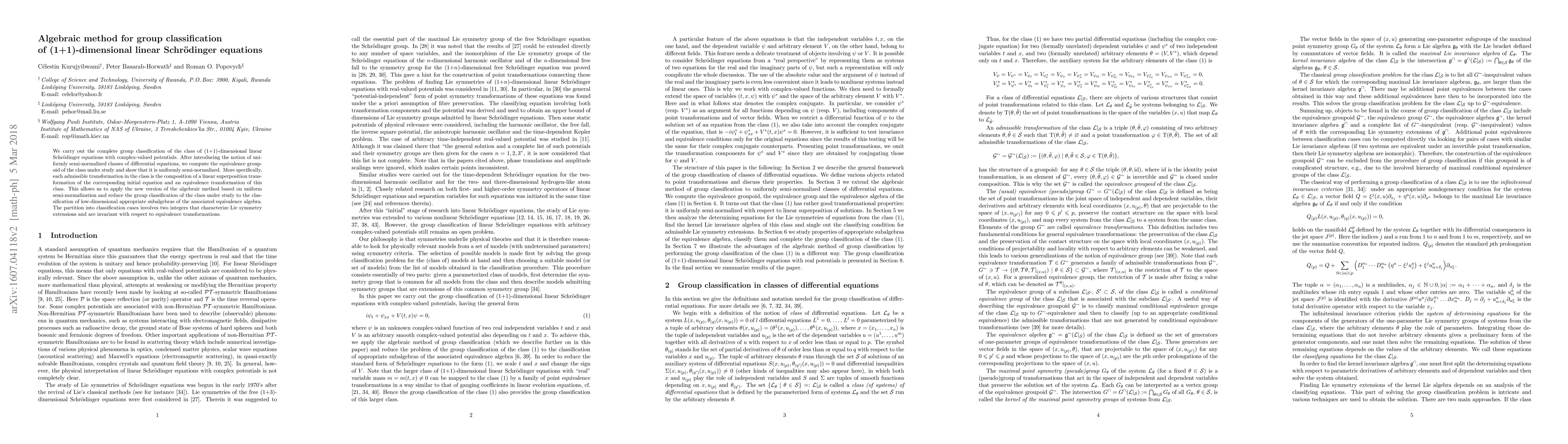This paper presents a complete group classification of (1+1)-dimensional linear Schrödinger equations with complex potentials using an algebraic method based on uniformly semi-normalized classes. The classification reduces to the analysis of low-dimensional subalgebras, with the partition determined by two integers characterizing Lie symmetry extensions.