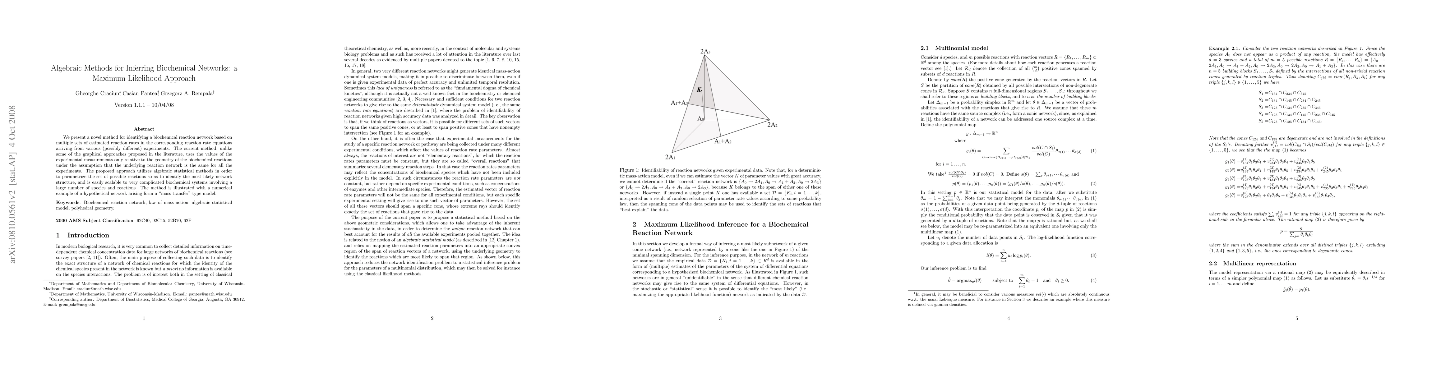 This paper introduces an algebraic statistical method for inferring biochemical networks using maximum likelihood, focusing on reaction rate equations from various experiments. The method identifies the most likely network structure based on experimental measurements, assuming a consistent underlying network across experiments, and demonstrates scalability to complex systems.