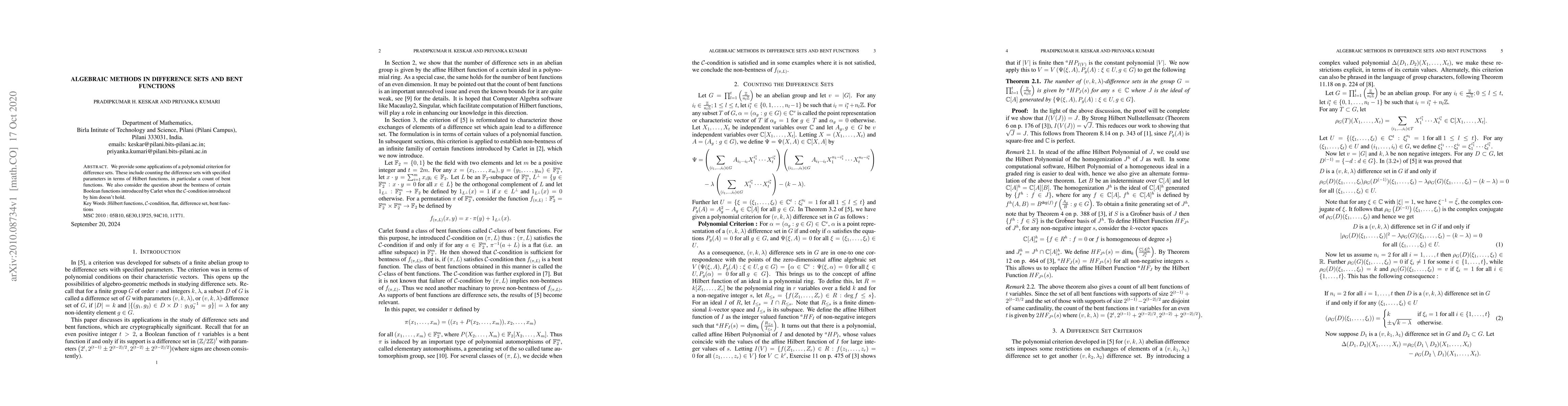 The paper employs algebraic methods, specifically a polynomial criterion for difference sets, to analyze bent functions and count difference sets with specified parameters using Hilbert functions.