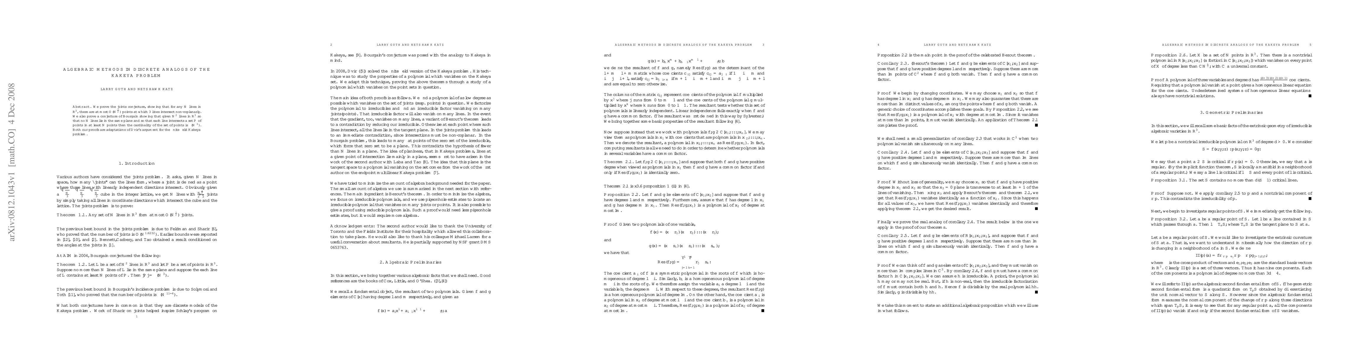We prove the joints conjecture, showing that for any $N$ lines in ${\Bbb R}^3$, there are at most $O(N^{{3 \over 2}})$ points at which 3 lines intersect non-coplanarly. We also prove a conjecture of Bourgain showing that given $N^2$ lines in ${\Bbb R}^3$ so that no $N$ lines lie in the same plane and so that each line intersects a set $P$ of points in at least $N$ points then the cardinality of the set of points is $\Omega(N^3)$. Both our proofs are adaptations of Dvir's argument for the finite field Kakeya problem.