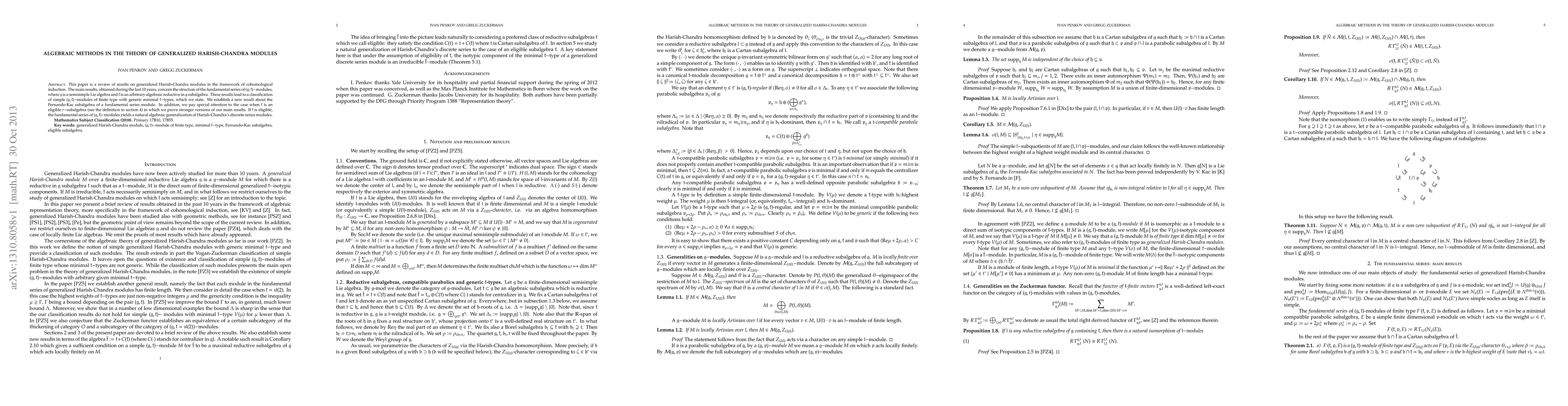 This paper is a review of results on generalized Harish-Chandra modules in the framework of cohomological induction. The main results, obtained during the last 10 years, concern the structure of the fundamental series of $(\mathfrak{g},\mathfrak{k})-$modules, where $\mathfrak{g}$ is a semisimple Lie algebra and $\mathfrak{k}$ is an arbitrary algebraic reductive in $\mathfrak{g}$ subalgebra. These results lead to a classification of simple $(\mathfrak{g},\mathfrak{k})-$modules of finite type with generic minimal $\mathfrak{k}-$types, which we state. We establish a new result about the Fernando-Kac subalgebra of a fundamental series module. In addition, we pay special attention to the case when $\mathfrak{k}$ is an eligible $r-$subalgebra (see the definition in section 4) in which we prove stronger versions of our main results. If $\mathfrak{k}$ is eligible, the fundamental series of $(\mathfrak{g},\mathfrak{k})-$modules yields a natural algebraic generalization of Harish-Chandra's discrete series modules.