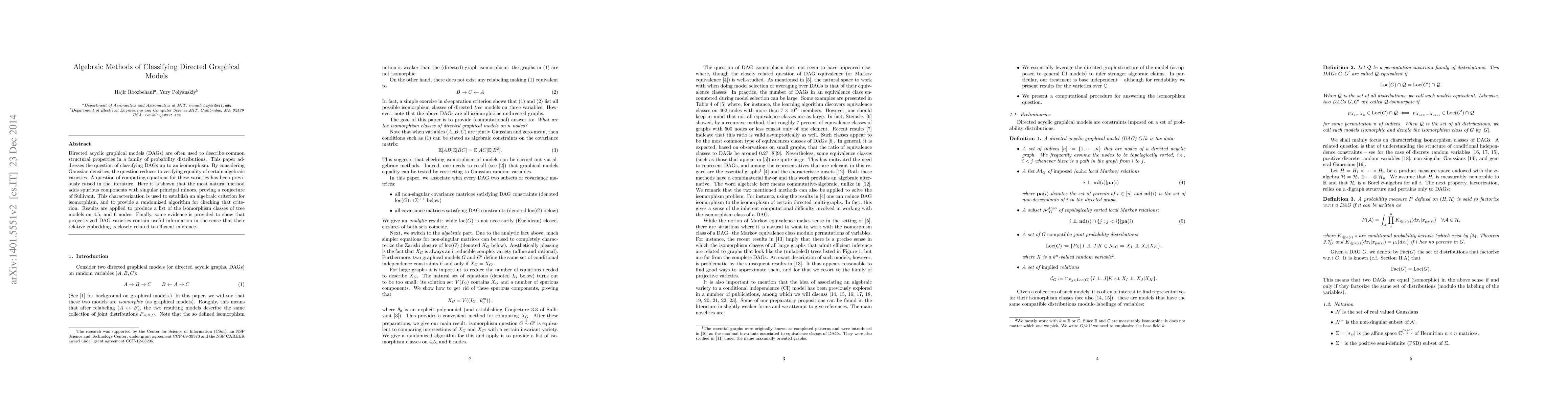 This paper develops algebraic methods for classifying directed acyclic graphical models (DAGs) up to isomorphism by reducing the problem to verifying equality of algebraic varieties. It provides a randomized algorithm for checking isomorphism and applies the method to classify tree models on 4, 5, and 6 nodes.