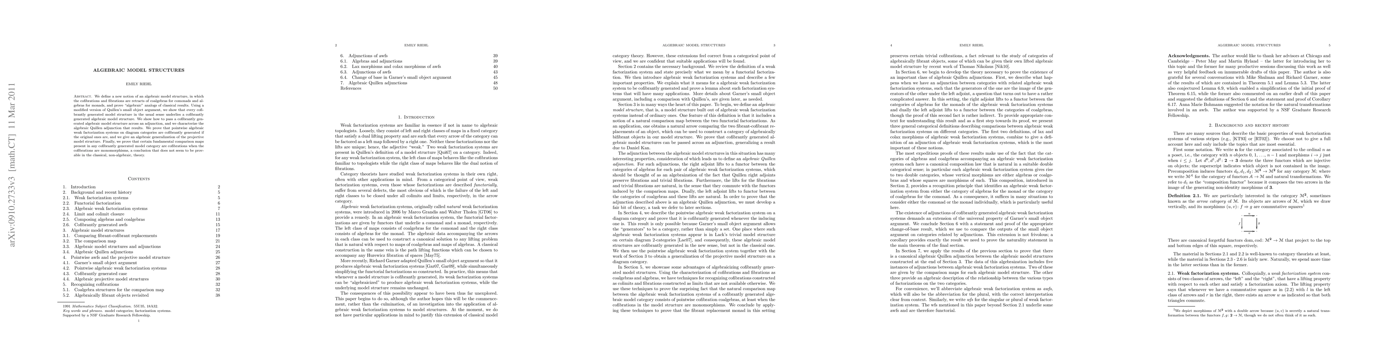 We define a new notion of an algebraic model structure, in which the cofibrations and fibrations are retracts of coalgebras for comonads and algebras for monads, and prove "algebraic" analogs of classical results. Using a modified version of Quillen's small object argument, we show that every cofibrantly generated model structure in the usual sense underlies a cofibrantly generated algebraic model structure. We show how to pass a cofibrantly generated algebraic model structure across an adjunction, and we characterize the algebraic Quillen adjunction that results. We prove that pointwise natural weak factorization systems on diagram categories are cofibrantly generated if the original ones are, and we give an algebraic generalization of the projective model structure. Finally, we prove that certain fundamental comparison maps present in any cofibrantly generated model category are cofibrations when the cofibrations are monomorphisms, a conclusion that does not seem to be provable in the classical, non-algebraic, theory.