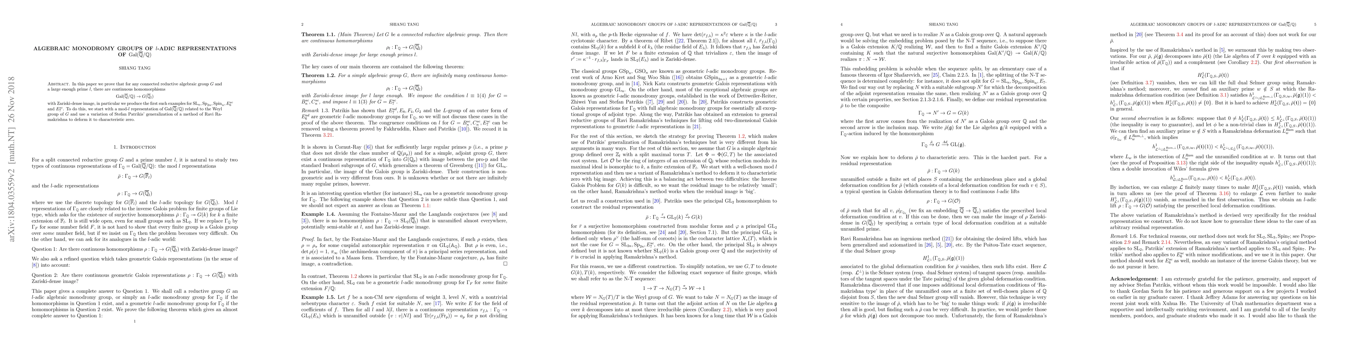 This paper demonstrates the existence of continuous homomorphisms from the absolute Galois group of rational numbers to the algebraic group $G(\bar\mathbb Q_l)$ with Zariski-dense image for large enough prime $l$, specifically for $SL_n, Sp_{2n}, Spin_n, E_6^{sc}$, and $E_7^{sc}$. The method involves deforming a mod-$l$ representation related to the Weyl group of $G$ to characteristic zero.