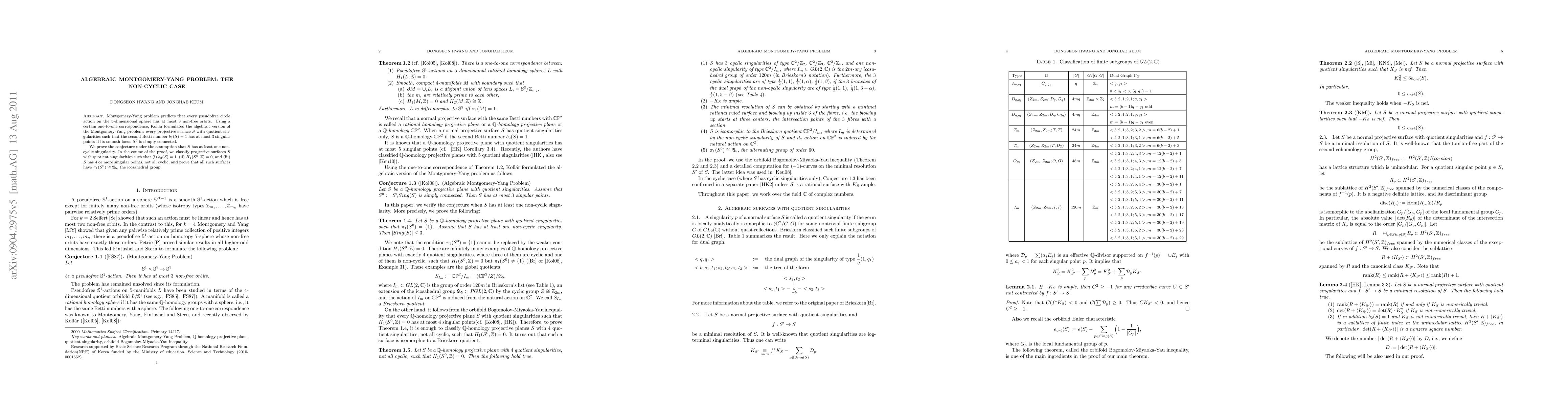 Montgomery-Yang problem predicts that every pseudofree differentiable circle action on the 5-dimensional sphere ${\mathbb S}^5$ has at most 3 non-free orbits. Using a certain one-to-one correspondence, Koll\'ar formulated the algebraic version of the Montgomery-Yang problem: every projective surface $S$ with quotient singularities such that $b_2(S) = 1$ has at most 3 singular points if its smooth locus $S^0$ is simply-connected. In this paper, we prove the conjecture under the assumption that $S$ has at least one noncyclic singularity. In the course of the proof, we classify projective surfaces $S$ with quotient singularities such that (i) $b_2(S) = 1$, (ii) $H_1(S^0, \mathbb{Z}) = 0$, and (iii) $S$ has 4 or more singular points, not all cyclic, and prove that all such surfaces have $\pi_1(S^0)\cong \mathfrak{A}_5$, the icosahedral group.