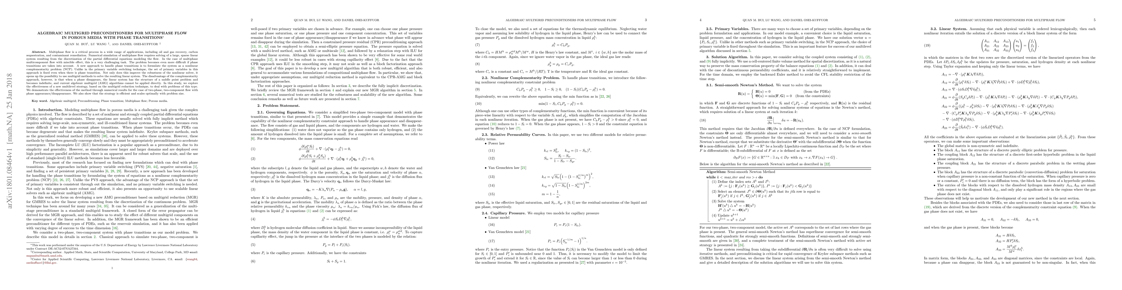 Multiphase flow is a critical process in a wide range of applications, including oil and gas recovery, carbon sequestration, and contaminant remediation. Numerical simulation of multiphase flow requires solving of a large, sparse linear system resulting from the discretization of the partial differential equations modeling the flow. In the case of multiphase multicomponent flow with miscible effect, this is a very challenging task. The problem becomes even more difficult if phase transitions are taken into account. A new approach to handle phase transitions is to formulate the system as a nonlinear complementarity problem (NCP). Unlike in the primary variable switching technique, the set of primary variables in this approach is fixed even when there is phase transition. Not only does this improve the robustness of the nonlinear solver, it opens up the possibility to use multigrid methods to solve the resulting linear system. The disadvantage of the complementarity approach, however, is that when a phase disappears, the linear system has the structure of a saddle point problem and becomes indefinite, and current algebraic multigrid (AMG) algorithms cannot be applied directly. In this study, we explore the effectiveness of a new multilevel strategy, based on the multigrid reduction technique, to deal with problems of this type. We demonstrate the effectiveness of the method through numerical results for the case of two-phase, two-component flow with phase appearance/disappearance. We also show that the strategy is efficient and scales optimally with problem size.