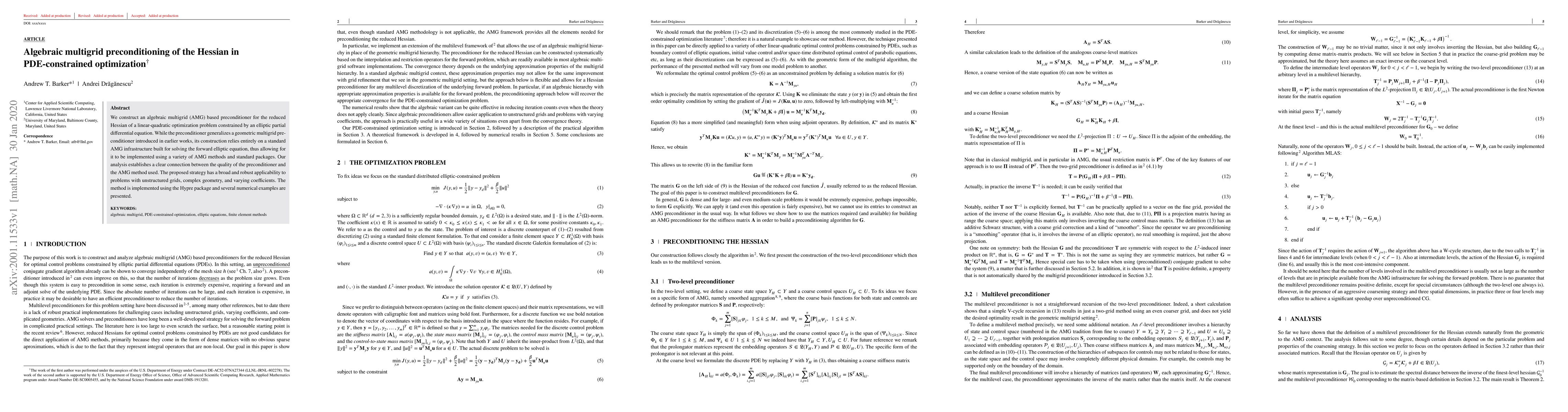 This paper develops an algebraic multigrid (AMG) preconditioner for the reduced Hessian in PDE-constrained optimization, generalizing earlier geometric multigrid preconditioners. The AMG-based approach is versatile, applicable to various AMG methods and packages, and demonstrated through numerical examples using the Hypre package.