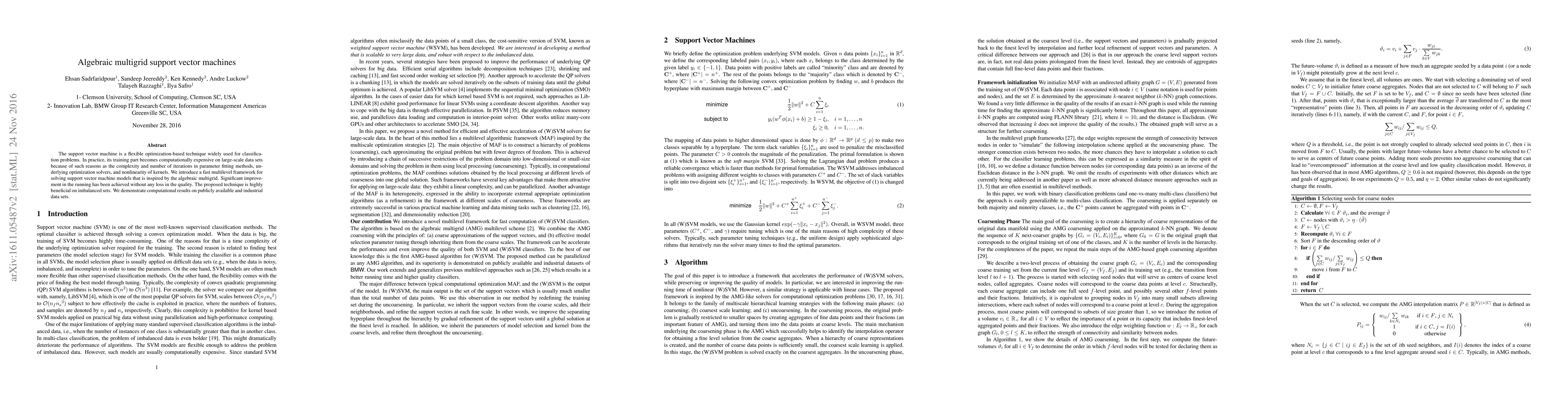 This paper proposes an algebraic multigrid-inspired framework to accelerate the training of support vector machines, significantly reducing computational time without compromising model quality, especially on large-scale and imbalanced datasets. Computational results on various data sets show substantial performance improvements.