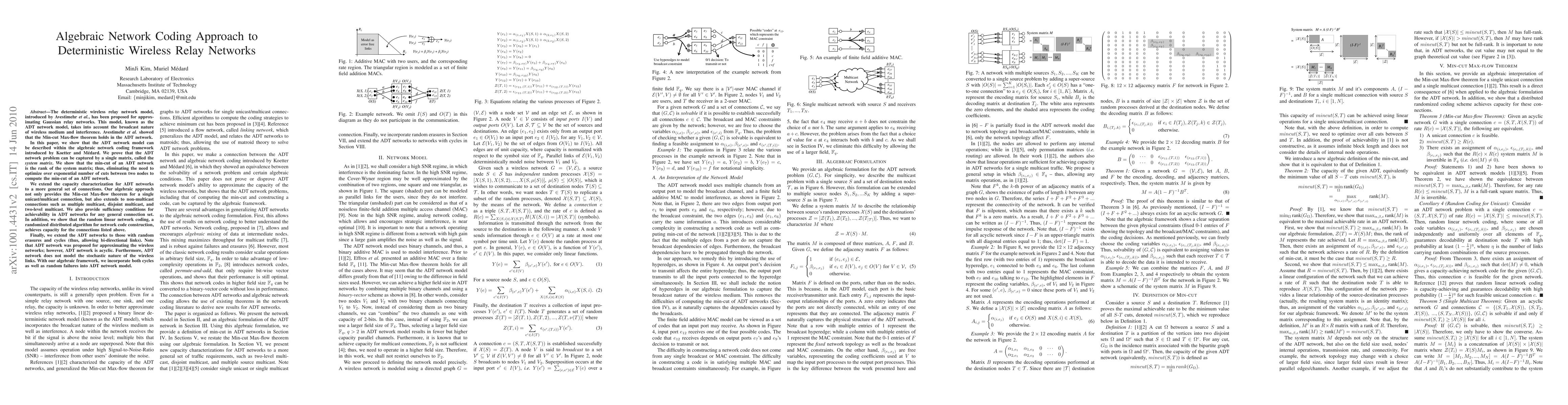 This paper introduces an algebraic network coding approach to deterministic wireless relay networks, specifically the ADT network model, showing that it can be captured by a single "system matrix" and that the min-cut is its rank. The authors extend capacity characterization to various connection types and demonstrate that random linear network coding achieves capacity for these connections, while also incorporating cycles and random erasures into the model.