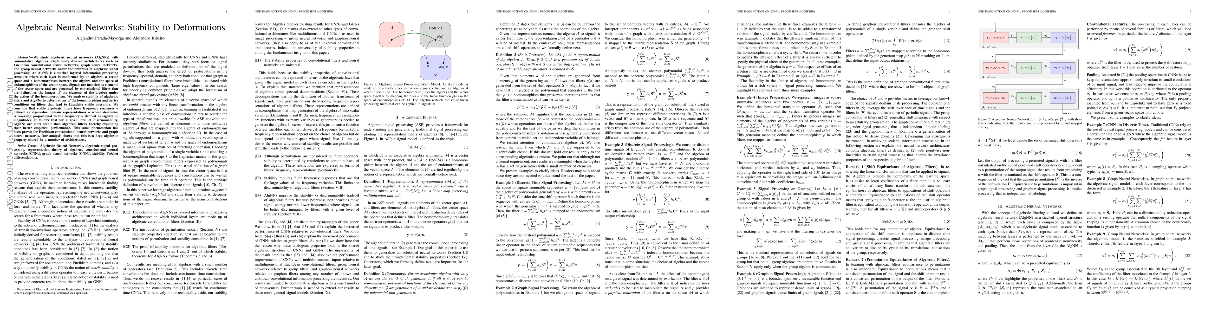We study algebraic neural networks (AlgNNs) with commutative algebras which unify diverse architectures such as Euclidean convolutional neural networks, graph neural networks, and group neural networks under the umbrella of algebraic signal processing. An AlgNN is a stacked layered information processing structure where each layer is conformed by an algebra, a vector space and a homomorphism between the algebra and the space of endomorphisms of the vector space. Signals are modeled as elements of the vector space and are processed by convolutional filters that are defined as the images of the elements of the algebra under the action of the homomorphism. We analyze stability of algebraic filters and AlgNNs to deformations of the homomorphism and derive conditions on filters that lead to Lipschitz stable operators. We conclude that stable algebraic filters have frequency responses -- defined as eigenvalue domain representations -- whose derivative is inversely proportional to the frequency -- defined as eigenvalue magnitudes. It follows that for a given level of discriminability, AlgNNs are more stable than algebraic filters, thereby explaining their better empirical performance. This same phenomenon has been proven for Euclidean convolutional neural networks and graph neural networks. Our analysis shows that this is a deep algebraic property shared by a number of architectures.