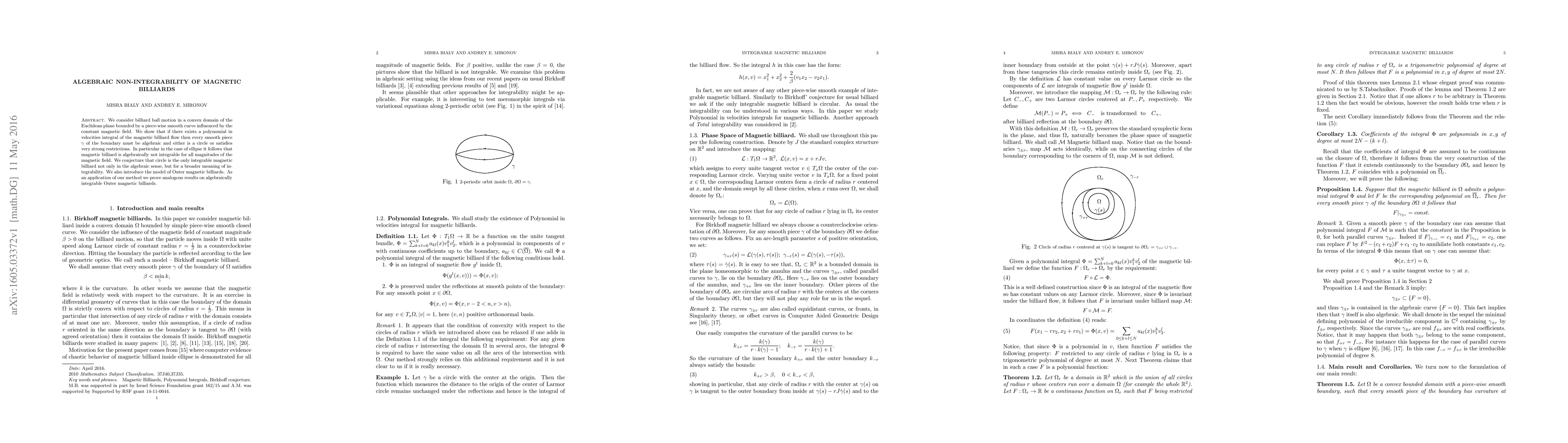 This research demonstrates that magnetic billiards in convex domains are algebraically non-integrable unless the boundary is a circle, revealing strong restrictions on smooth pieces that could allow polynomial integrals. The study also introduces Outer magnetic billiards and proves similar results for these systems.