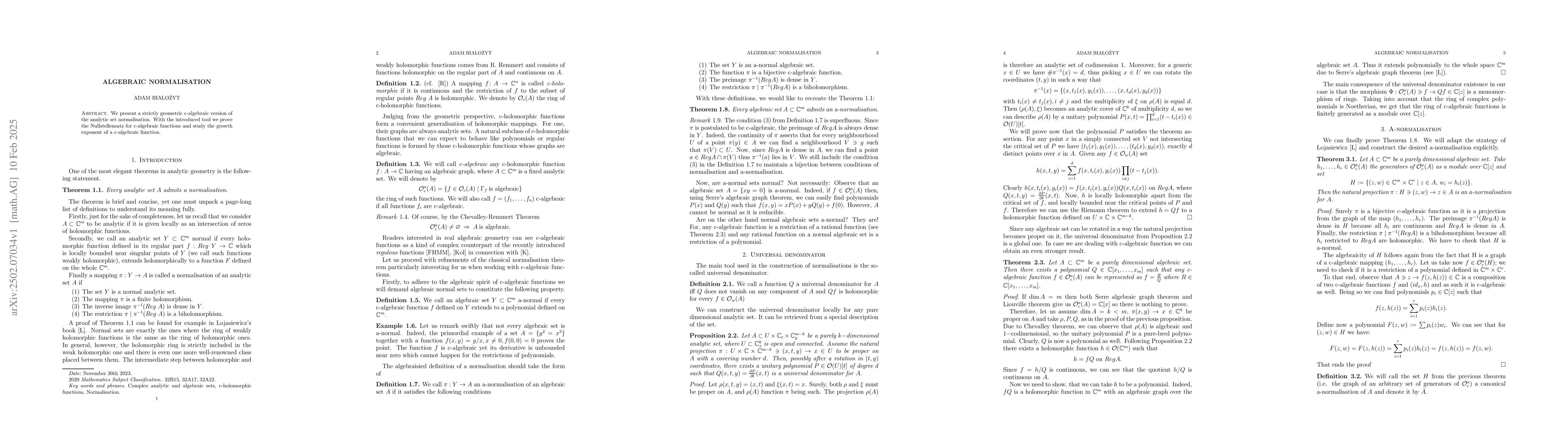 The paper introduces a strictly geometric c-algebraic version of analytic set normalization, utilizing a universal denominator to prove the Nullstellensatz for c-algebraic functions and study the growth exponent of a c-algebraic function.