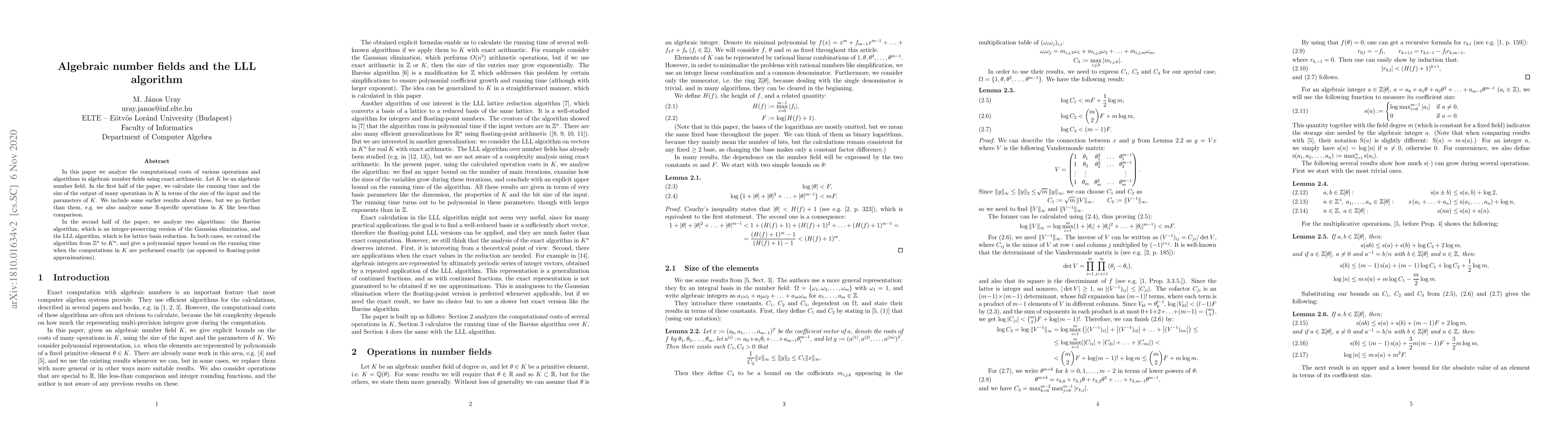 This paper analyzes computational costs of operations in algebraic number fields using exact arithmetic, providing polynomial upper bounds for algorithms like the Bareiss algorithm and LLL algorithm.