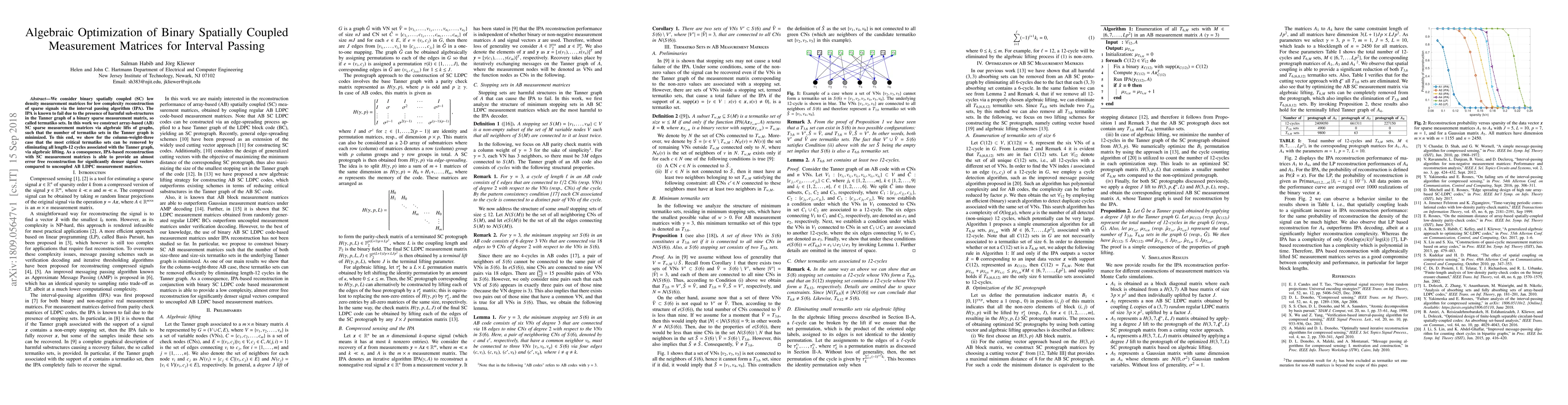 This paper proposes algebraic optimization techniques to construct binary spatially coupled measurement matrices that minimize harmful sub-structures, known as termatiko sets, to improve the interval passing algorithm's reconstruction accuracy for sparse signals. The method effectively removes critical termatiko sets by eliminating length-12 cycles, leading to near-error-free reconstruction for denser signal vectors.