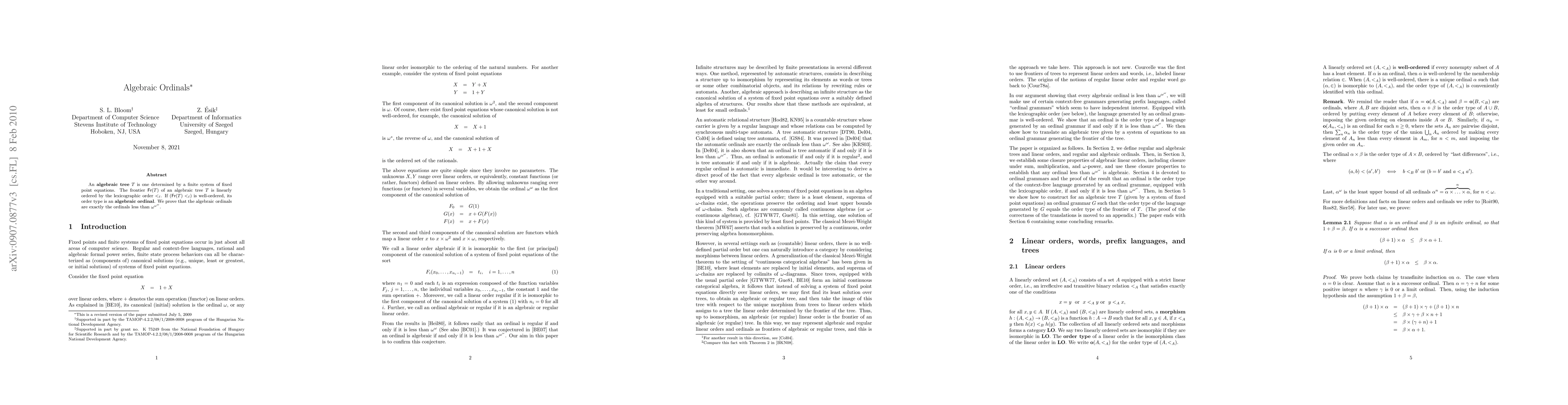 An algebraic tree T is one determined by a finite system of fixed point equations. The frontier \Fr(T) of an algebraic tree t is linearly ordered by the lexicographic order \lex. When (\Fr(T),\lex) is well-ordered, its order type is an \textbf{algebraic ordinal}. We prove that the algebraic ordinals are exactly the ordinals less than $\omega^{\omega^\omega}$.