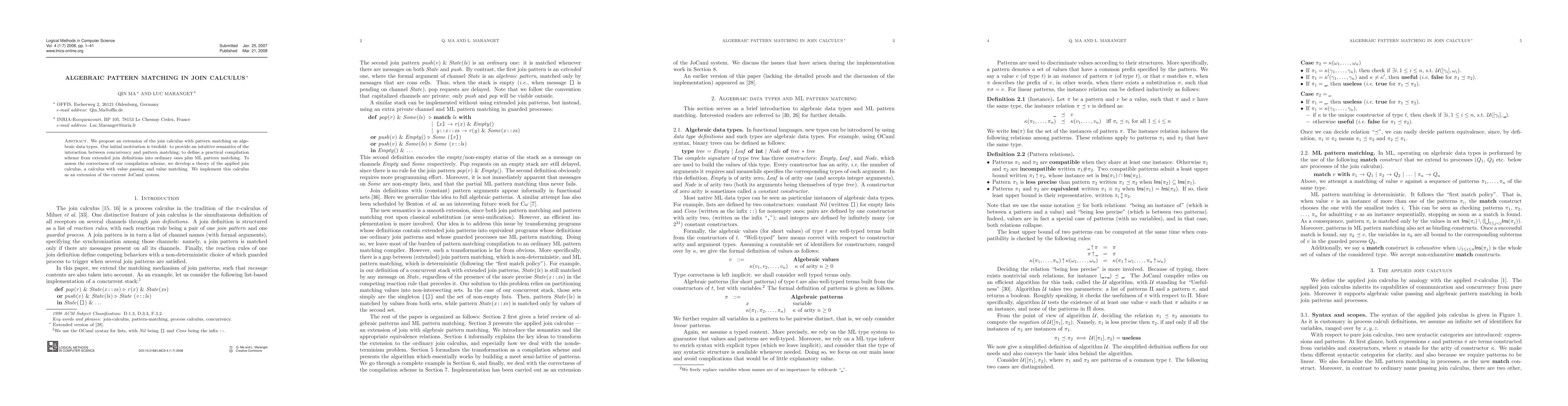 This paper extends join calculus to incorporate pattern matching on algebraic data types, aiming to clarify the interaction between concurrency and pattern matching, and to develop a practical compilation scheme. The authors implement and validate their approach within the JoCaml system.
