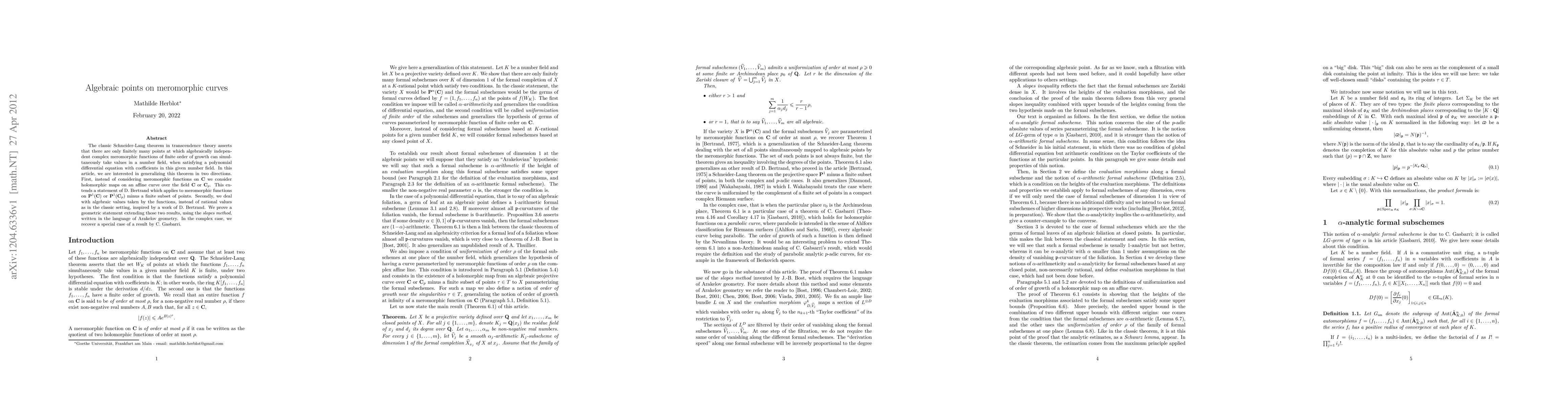 The classic Schneider-Lang theorem in transcendence theory asserts that there are only finitely many points at which algebraically independent complex meromorphic functions of finite order of growth can simultaneously take values in a number field, when satisfying a polynomial differential equation with coefficients in this given number field. In this article, we are interested in generalizing this theorem in two directions. First, instead of considering meromorphic functions on C we consider holomorphic maps on an affine curve over the field C or C_p. This extends a statement of D. Bertrand, which applies to meromorphic functions on P^1(C) or P^1(C_p) minus a finite subset of points. Secondly, we deal with algebraic values taken by the functions, instead of rational values as in the classic setting, inspired by a work of D. Bertrand. We prove a geometric statement extending those two results, using the slopes method, written in the language of Arakelov geometry. In the complex case, we recover a special case of a result by C. Gasbarri.