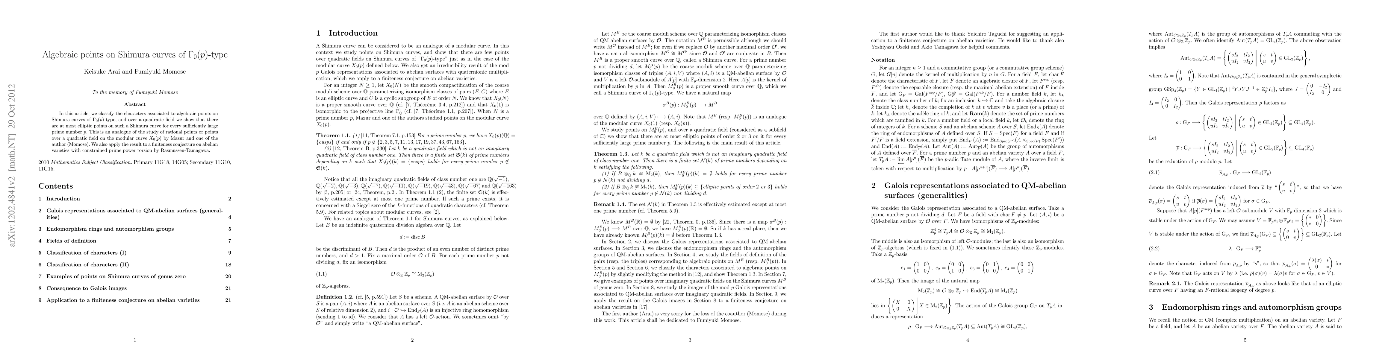 This paper classifies characters linked to algebraic points on Shimura curves of $\Gamma_0(p)$-type and demonstrates that for large primes $p$, there are at most elliptic points over quadratic fields. It extends the study of rational points on modular curves by Mazur and Momose, and applies the findings to a conjecture on abelian varieties with specific torsion constraints.