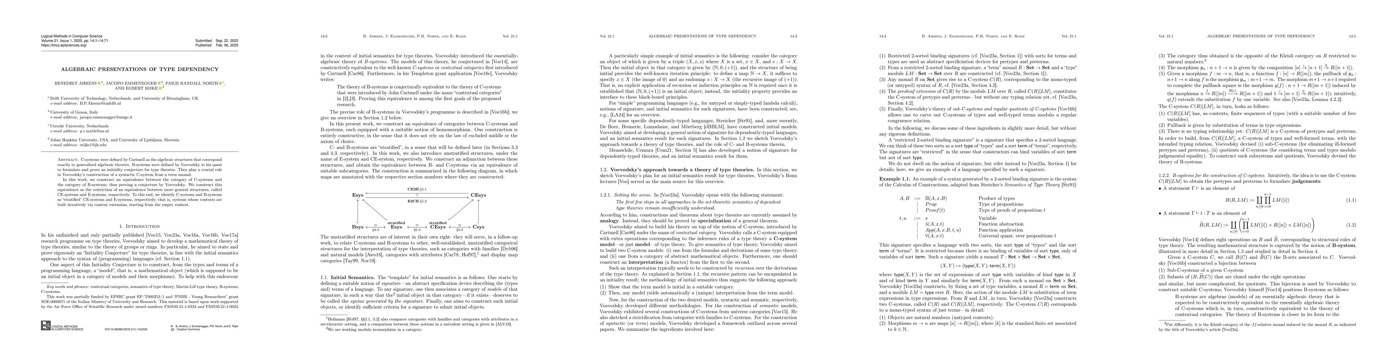 C-systems were defined by Cartmell as the algebraic structures that correspond exactly to generalised algebraic theories. B-systems were defined by Voevodsky in his quest to formulate and prove an initiality conjecture for type theories. They play a crucial role in Voevodsky's construction of a syntactic C-system from a term monad. In this work, we construct an equivalence between the category of C-systems and the category of B-systems, thus proving a conjecture by Voevodsky. We construct this equivalence as the restriction of an equivalence between more general structures, called CE-systems and E-systems, respectively. To this end, we identify C-systems and B-systems as "stratified" CE-systems and E-systems, respectively; that is, systems whose contexts are built iteratively via context extension, starting from the empty context.