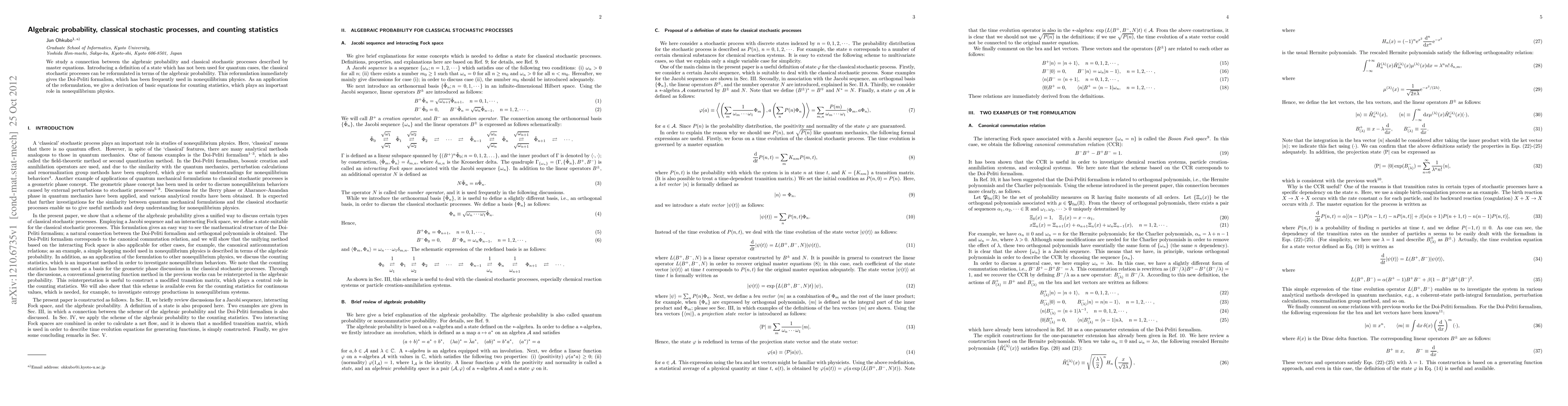 This paper establishes a link between algebraic probability and classical stochastic processes, reformulating the latter in terms of algebraic probability to derive the Doi-Peliti formalism. It also applies this reformulation to derive fundamental equations for counting statistics, crucial in nonequilibrium physics.