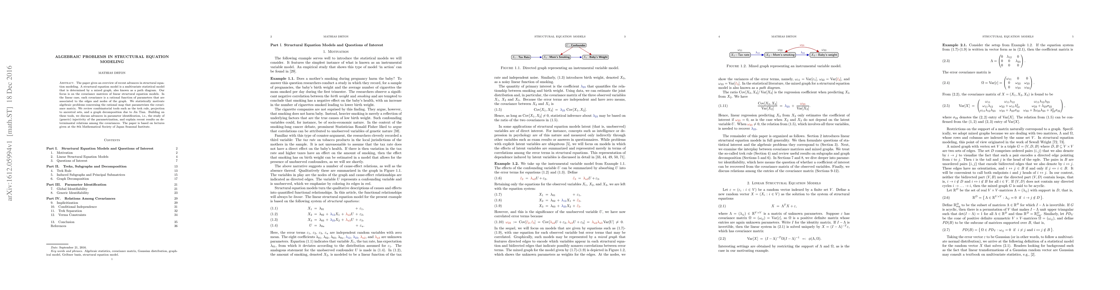 This paper explores recent advances in structural equation modeling, focusing on algebraic problems related to covariance matrices and parameter identification. It discusses combinatorial tools and builds upon them to explain advances in parameter identification and determinantal relations among covariances.